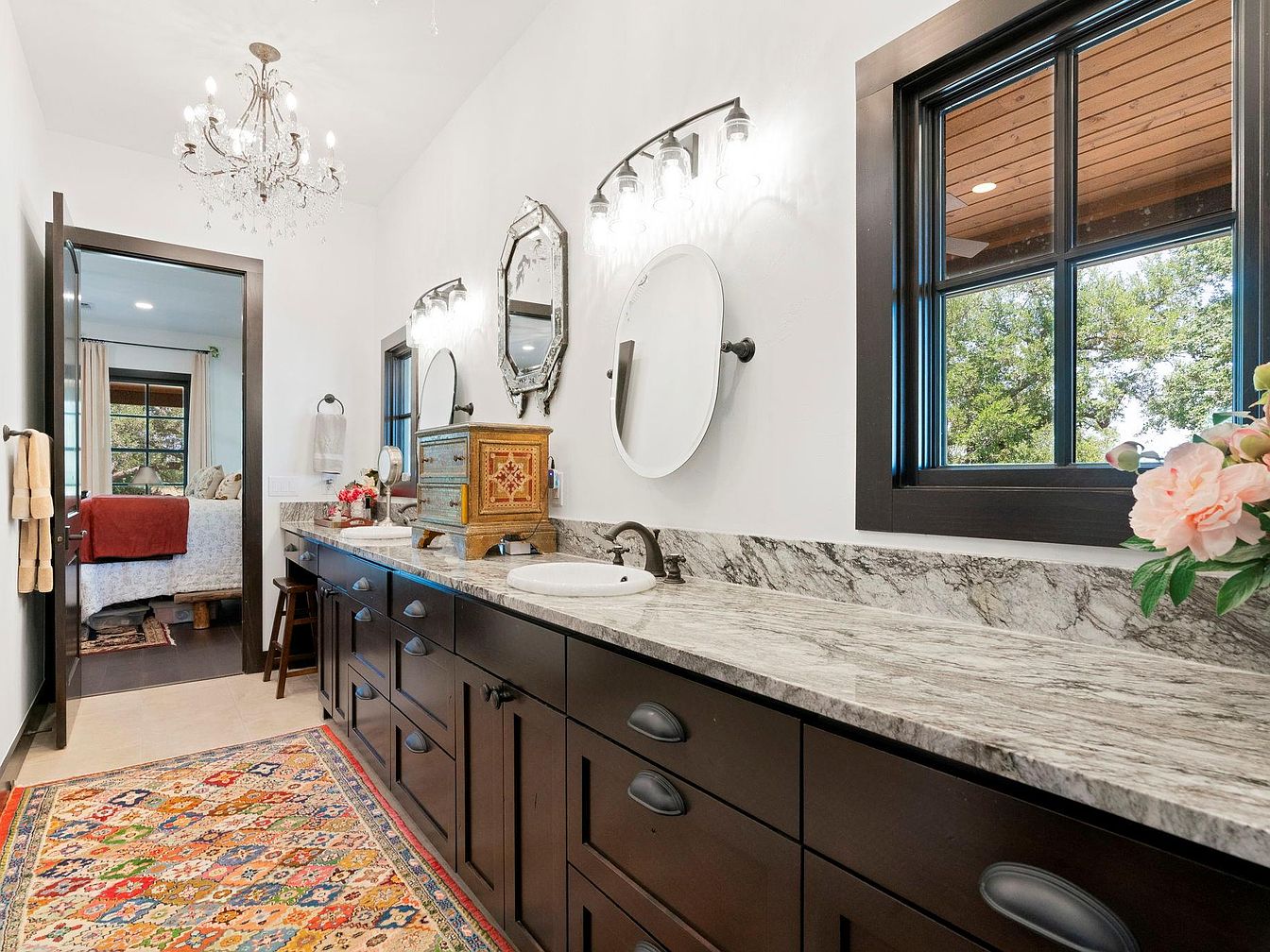 This spacious bathroom vanity area features an elongated marble countertop with dual sinks, ideal for family use. Dark wood cabinetry offers abundant storage, complemented by elegant, vintage-inspired mirrors and chic lighting fixtures. A sparkling chandelier adds a touch of glamor above, while a large window brings in natural light and scenic views. The area is softened by a colorful, patterned rug, making it inviting for both kids and adults. The transition to an adjoining bedroom is seamless, providing easy flow between spaces. Fresh flowers, practical towel holders, and ample counter space combine to deliver a functional yet warm, welcoming atmosphere.