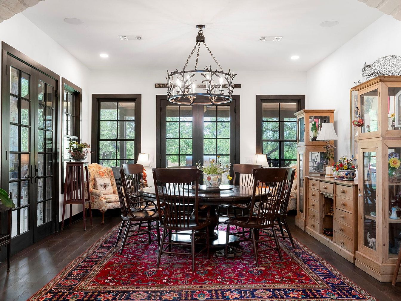 A sunlit dining room blends classic charm with family-friendly comfort. Tall black-trimmed French doors and windows let in natural light, offering lovely outdoor views. A large dark wood round table surrounded by spindle-back chairs rests atop a vibrant Persian-style rug that anchors the space with warmth and color. Two light wood display cabinets with glass doors showcase pottery and keepsakes, adding a personal touch. Soft white walls keep the atmosphere bright, while cozy elements like an upholstered floral armchair and table lamps invite relaxation. The statement chandelier overhead completes the room’s welcoming, sophisticated feel, perfect for gatherings and everyday meals.