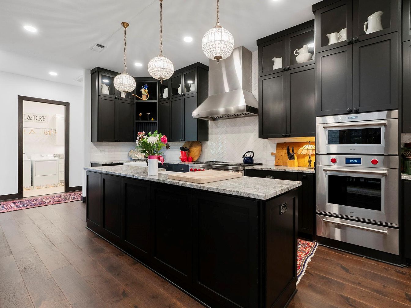 This inviting kitchen features a spacious island with elegant marble countertops, perfect for family meal prep or casual gatherings. Black cabinetry provides a sleek, modern aesthetic, complemented by stainless steel appliances and a statement range hood. Bright pendant lights and glass cabinet displays add a touch of sophistication. The space boasts warm, wide-plank hardwood floors and an open layout that connects seamlessly to a nearby laundry area, ideal for family functionality. Subtle decorative accents and a cozy runner rug enhance the warmth and character, making this kitchen a beautiful blend of style and everyday practicality.