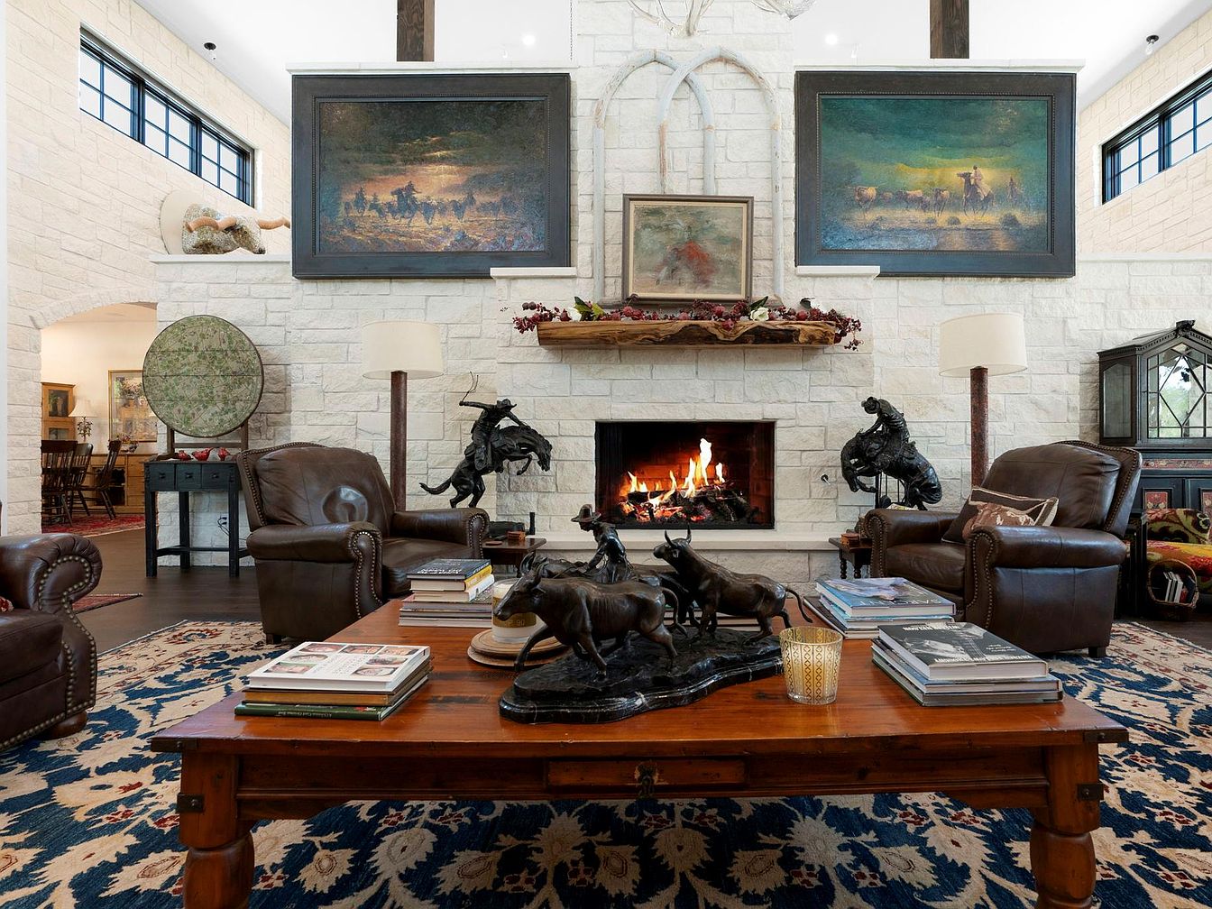 A welcoming living room centers around a striking stone fireplace adorned with Western-themed art and decorations, radiating a sense of warmth and tradition. Deep brown leather armchairs provide plush seating around an expansive wooden coffee table, which is decorated with books and equestrian sculptures, appealing to both adults and children. Large patterned rugs anchor the space, softening the dark wood floors and enhancing comfort for play or relaxation. Natural light pours in through high windows, illuminating ivory stone walls and rich wood accents. The spacious, inviting design lends itself to family gatherings, conversation, and cozy evenings by the fire.