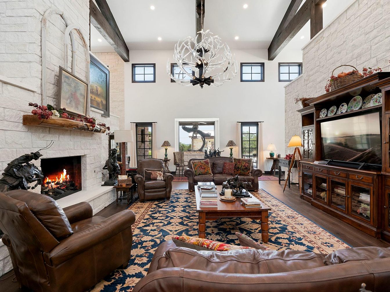 Expansive and inviting, this living room seamlessly blends rustic charm with comfortable elegance. Rich brown leather armchairs and a cozy sofa with colorful pillows gather around a grand stone fireplace, setting the tone for warmth and family gatherings. Beamed ceilings add architectural drama while high windows flood the space with natural light. A large ornamental antler chandelier makes a bold statement, and the use of wood—seen in the coffee table and entertainment center—provides classic appeal. Decorative touches like a patterned area rug and thoughtfully displayed art and collections create a space that balances sophistication and family-friendly hospitality.