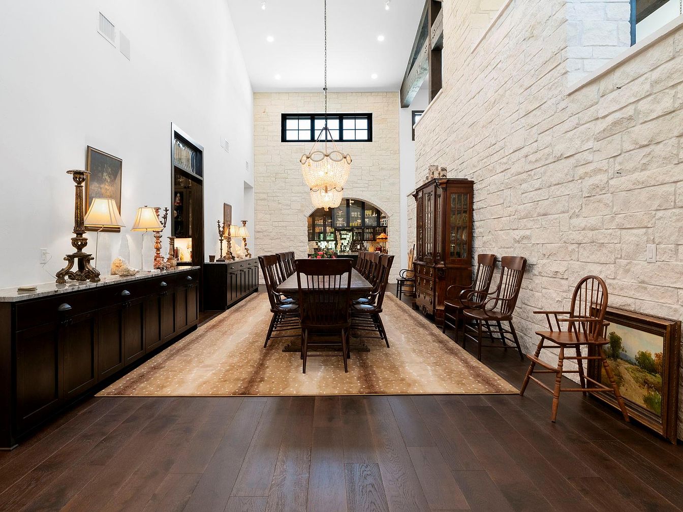 A grand formal dining room with soaring ceilings features a long, elegant wooden dining table surrounded by matching spindle-back chairs, ideal for large family gatherings or entertaining guests. The warm, rich tone of the hardwood floors is complemented by a soft, neutral area rug that anchors the seating arrangement. One wall showcases striking white stonework, adding texture and an upscale rustic charm, while the opposite wall boasts custom cabinetry topped with decorative lamps and art pieces. Tall windows allow natural light to fill the room, and a stunning chandelier serves as an elegant centerpiece, creating a welcoming space for memorable meals.