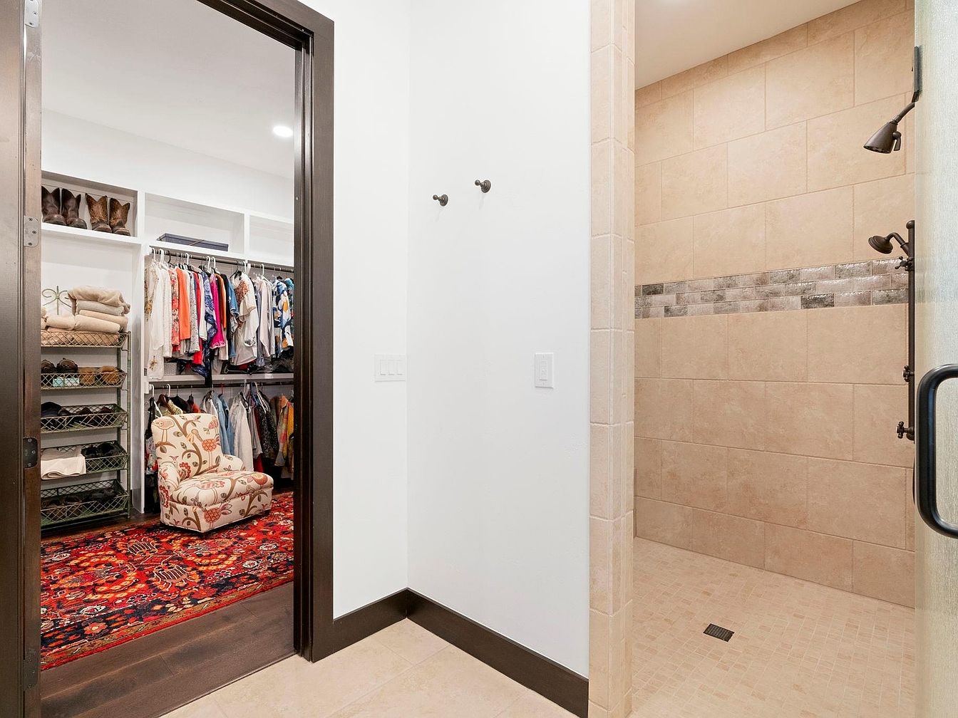 Spacious and thoughtfully designed, this walk-in closet adjoins a modern tiled shower, creating a seamless master suite layout ideal for busy families. Custom open shelving and hanging space keeps clothing, shoes, and accessories organized and easily accessible, while a decorative area rug adds color and warmth to the dark wood floors. An inviting floral accent chair in the corner offers a cozy spot for dressing or relaxing. Neutral tile and matte black fixtures in the adjacent shower contribute to a fresh, clean aesthetic. The neutral wall palette and dark trim blend modern comfort with functional family-friendly sensibility.