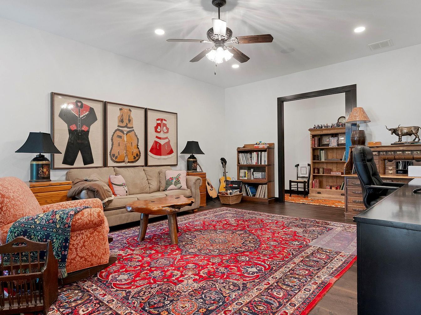 This inviting family living room features a comfortable, neutral-toned sofa adorned with charming throw pillows, paired with a cozy, patterned armchair for ample seating. A vibrant Persian-style rug adds warmth and a pop of color, complementing the dark wood floors and providing a soft play area for children. Rustic wooden furniture, including bookshelves and a unique coffee table, creates a welcoming and practical atmosphere. Framed folk art costumes along one wall provide artistic character, while shelves filled with books and decorative items encourage family engagement and learning. A ceiling fan and understated recessed lighting ensure the space feels bright, calm, and family friendly.