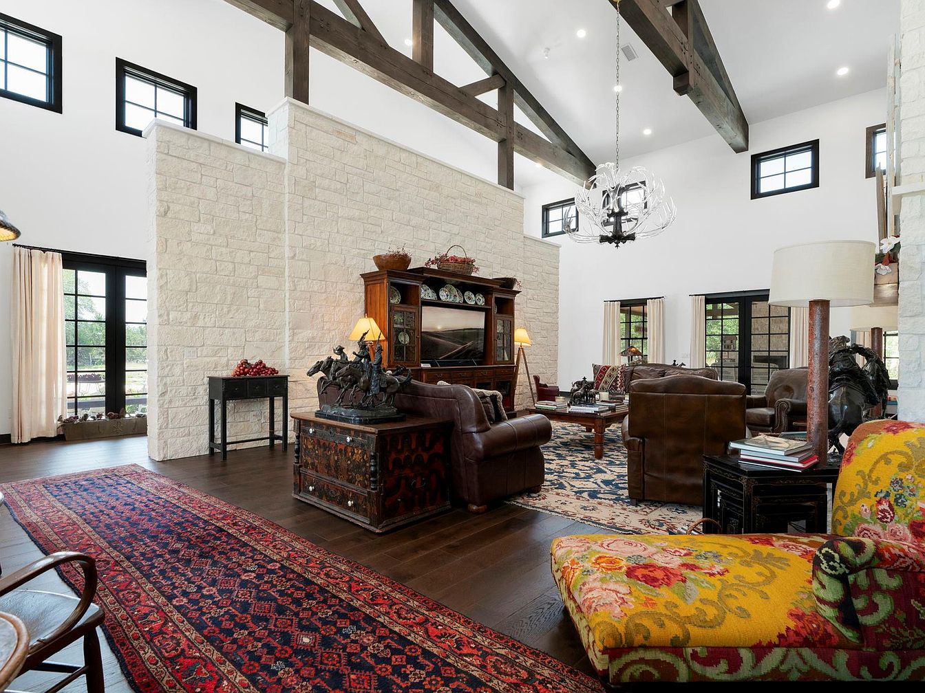 A spacious and inviting living room with soaring ceilings, striking exposed wood beams, and abundant natural light streaming through generously sized windows. The stone accent walls add warmth and texture, beautifully contrasting with the crisp white paint. Comfortable brown leather armchairs and a plush floral chaise lounge create cozy seating areas, while patterned area rugs offer both color and softness underfoot—ideal for family gatherings or children playing. Antique wooden furniture and decorative pieces provide an elegant, timeless atmosphere. French doors and large windows connect the space to the outdoors, and neutral drapes soften the look for a welcoming, family-friendly environment.
