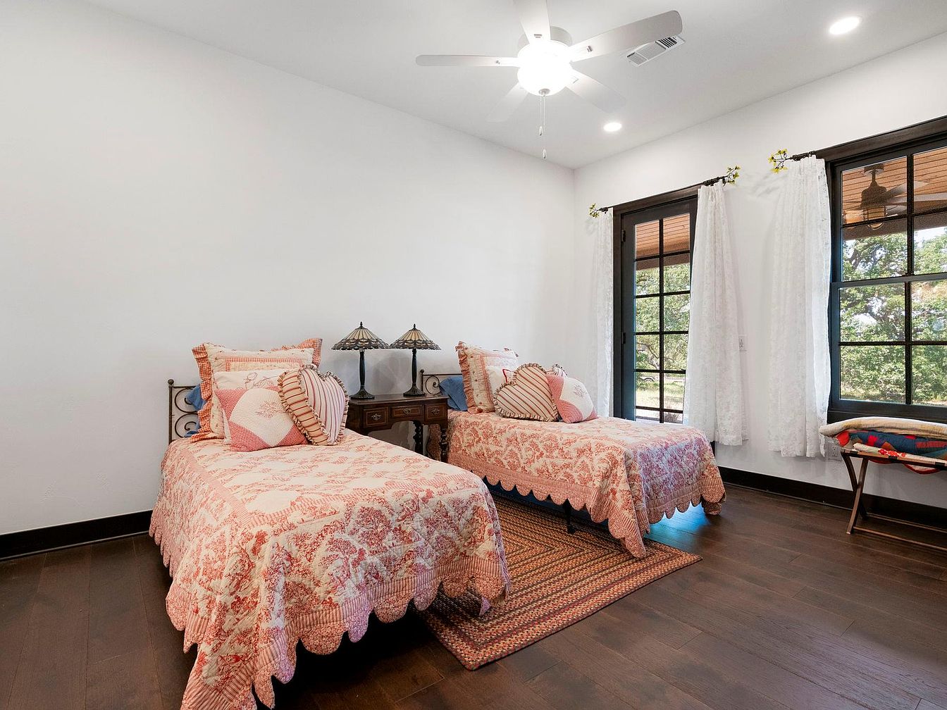 A welcoming bedroom featuring two twin beds adorned with matching pink and cream patchwork quilts, creating a soft, inviting ambiance perfect for children or guests. Between the beds, a vintage-style wooden nightstand topped with classic lamps adds charm and practicality. The space is bright and airy thanks to large, black-framed windows that offer scenic outdoor views and are dressed with delicate, sheer white curtains. Warm-toned hardwood floors anchor the room, complemented by a woven rug for added comfort. The thoughtful layout, neutral walls, and whimsical decorative pillows make this a cozy, family-friendly haven ideal for relaxation and togetherness.