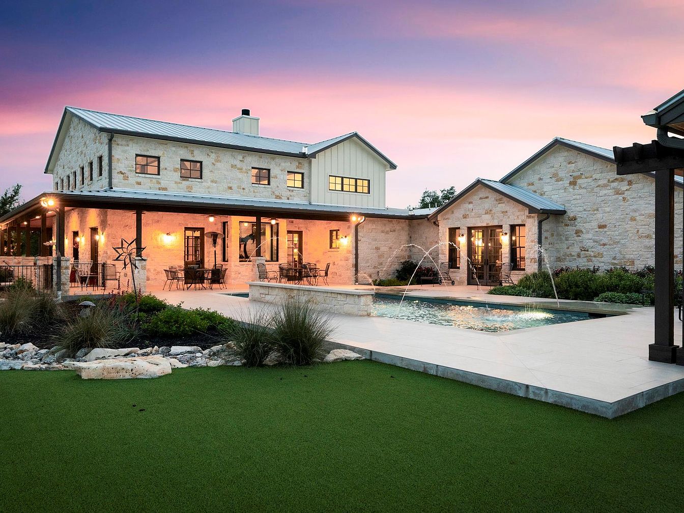 A tranquil backyard space showcases a large rectangular pool with elegant arched water features, surrounded by light stone decking perfect for family gatherings. The home’s pale stone exterior and metal roofing exude rural American charm while shaded patios offer ample seating and outdoor dining options. Warm outdoor lights and wrought iron furniture create a cozy yet refined atmosphere. Lush landscaping with ornamental grasses and stone details frame the pool, providing safe and inviting play areas for children. The seamless flow from the home to the yard ensures easy access, blending comfort, functionality, and entertainment in an inviting family-friendly retreat.