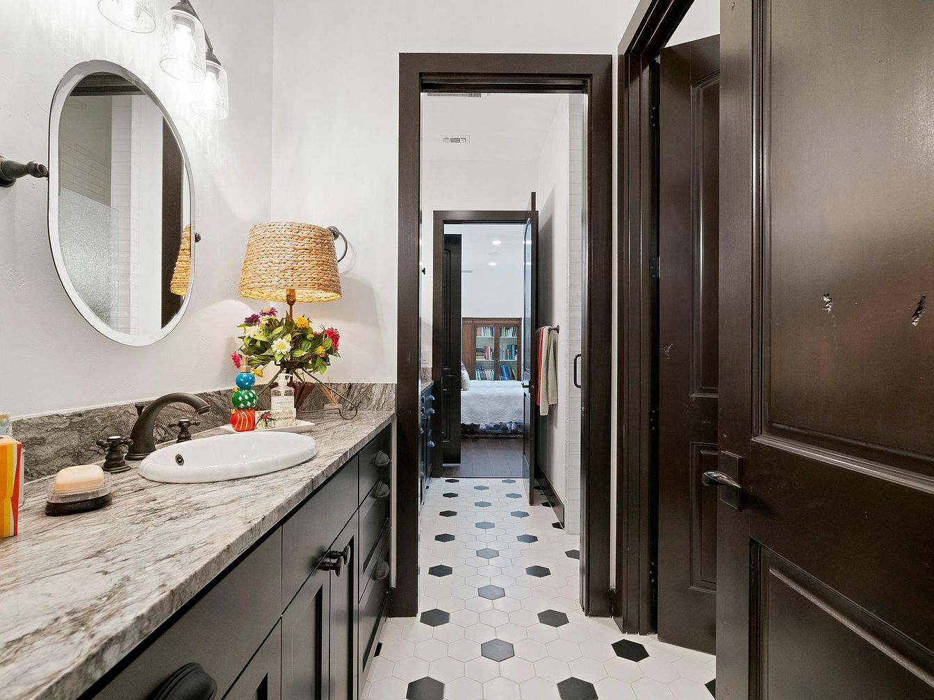 A spacious bathroom vanity area features a luxurious stone countertop, deep espresso cabinetry, and a crisp white sink paired with matte black fixtures for a modern yet timeless look. The hexagonal floor tiles in black and white create visual interest and a playful touch, making the space inviting for families with children. A large oval mirror, under elegant glass wall sconces, reflects abundant light, while a woven lamp and fresh floral arrangement add warmth and personality. The doorway leads to a well-lit adjacent room, making this bathroom practical for busy mornings and enhancing connectivity within the home.