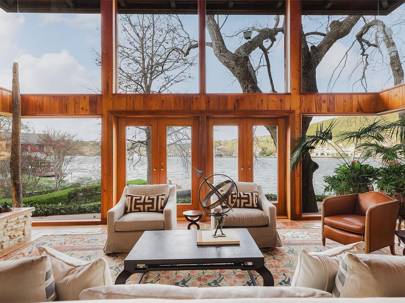 Flooded with natural light, this inviting living room offers panoramic lake views through expansive floor-to-ceiling windows and double glass doors. Warm wood paneling and trim blend seamlessly with the peaceful outdoor scenery, while comfortable armchairs and a welcoming leather seat create a cozy seating area around a stylish coffee table. The geometric throw pillows and patterned area rug introduce a modern touch, and lush greenery brings the outside in. Spacious layout is perfect for family gatherings or entertaining guests, with durable, easy-to-clean surfaces and plenty of open space for children to play.