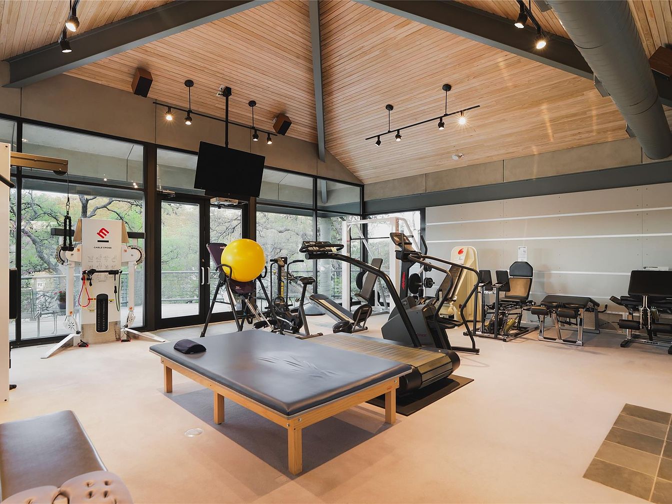 Spacious and bright, this modern home gym features floor-to-ceiling windows that provide abundant natural light and sweeping views of the serene outdoors, creating a refreshing workout environment. The vaulted ceiling with pale wood paneling and exposed beams adds to the airy ambiance. Equipped with various exercise machines, a stretching table, and ample open space, the gym is ideal for fitness enthusiasts of all ages. The neutral palette provides a calming backdrop, while sleek lines and robust equipment ensure both style and functionality. A mounted television and subtle track lighting complete this family-friendly, motivational fitness space.