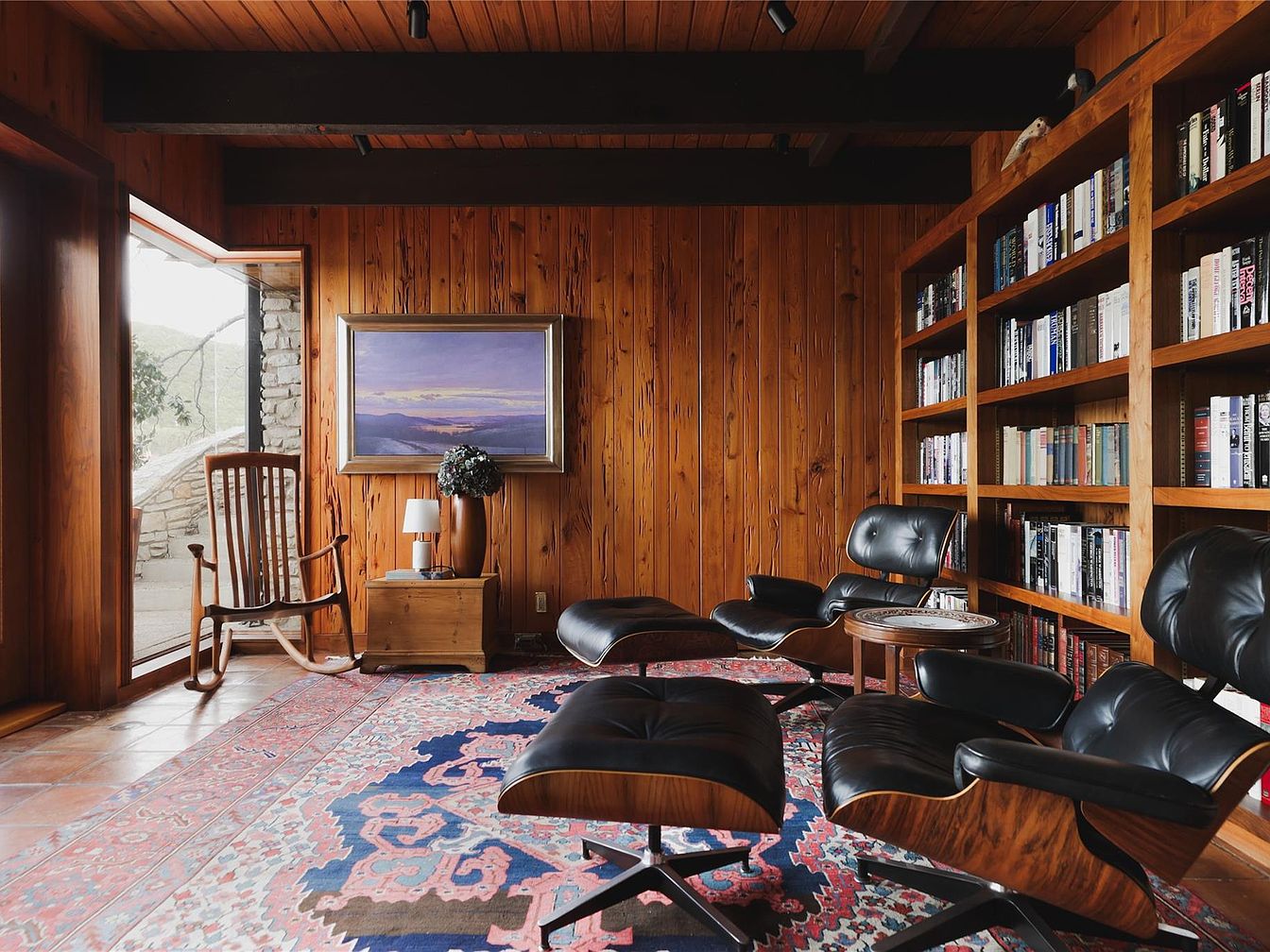 Warm wood-paneled walls and ceiling beams create a cozy, inviting library lounge designed for relaxation and family gatherings. Tall built-in bookshelves line one wall, filled with a diverse selection of books, while two iconic black leather lounge chairs with matching ottomans promise comfort for reading or conversation. A plush, patterned area rug introduces rich blues and reds, adding vibrancy against the natural wood tones. Soft natural light pours through a large window, highlighting a classic rocking chair and an artfully arranged side table. The open layout ensures plenty of space for children to play and adults to unwind in style.