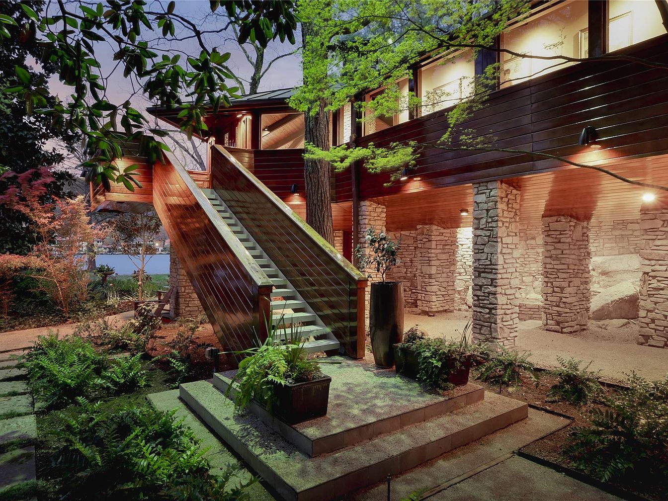 A dramatic staircase creates a welcoming entry to this modern American home, blending natural materials and thoughtful landscaping. Warm wooden railings and horizontal siding harmonize with rugged stone columns, exuding a contemporary yet inviting atmosphere for families. Flanked by lush greenery and shaded by mature trees, the path leads to a spacious landing, ensuring a safe, attractive transition from outdoors to indoors. Subtle lighting accents the architecture and enhances safety for nightly arrivals. The overall design emphasizes openness and connection to nature, offering a serene and family-friendly environment perfect for gatherings, playtime, and daily living alike.