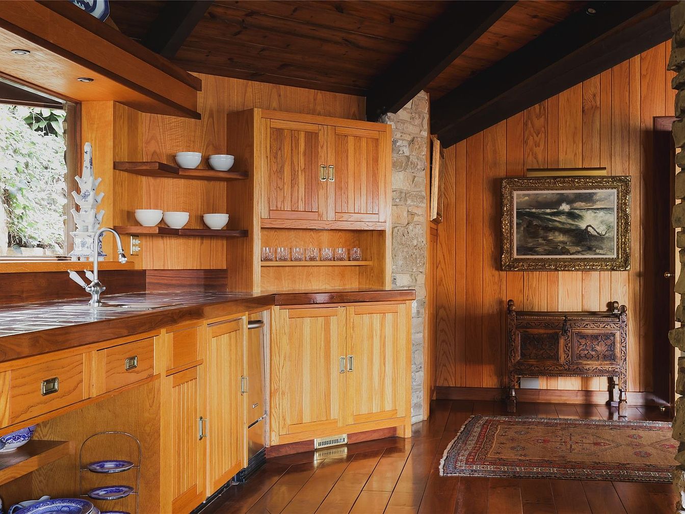 Warm wood cabinetry lines the kitchen, complemented by matching paneled walls and a polished wooden floor, creating a cozy, inviting space. The countertop offers ample workspace, and the deep farmhouse sink sits beneath a large window that brings in natural light. Open shelves are neatly arranged with bowls and glassware, making it easy for family members to grab what they need. Vintage charm is elevated by a detailed oriental rug and an ornate wooden chest, while a framed coastal painting adds character. The open layout is perfect for busy family routines and easy conversation during meal prep.