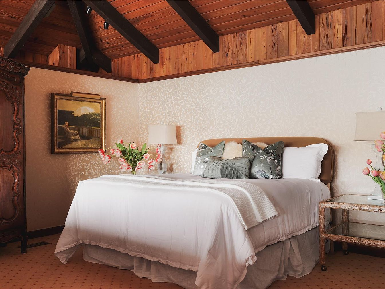 Warm wood-paneled ceilings and exposed beams create a welcoming, rustic charm in the bedroom, while soft beige wallpaper with delicate foliage patterns adds a touch of elegance. A plush, inviting bed with crisp white linens and decorative throw pillows sits centered in the room, flanked by classic, textured side tables crowned with fresh bouquets of tulips and soft-glow lamps. Thoughtfully chosen artwork and an ornate wooden armoire introduce personality and a sense of history. The overall layout allows for easy movement and relaxation, making this a restful and family-friendly place for unwinding or spending time together.