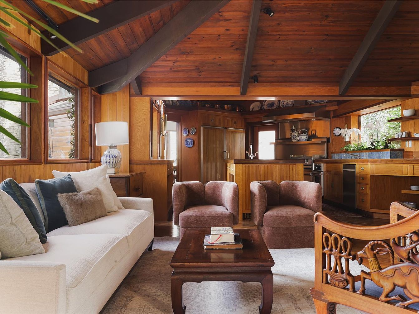 Warm wood paneling and vaulted ceilings create a cozy, inviting atmosphere in this open-concept living space, which seamlessly connects the living room with the kitchen. Large windows allow for abundant natural light, while leafy plants bring a touch of nature indoors. The living area features a plush, cream sofa complemented by an array of soft, textured pillows and two comfortable, earth-toned armchairs, perfect for family gatherings. A carved wooden coffee table and chair add charm and character. The kitchen’s clean lines, stainless steel finishes, and generous counter space make it highly functional for everyday family life and entertaining.