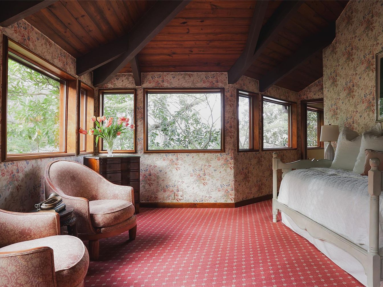 A cozy bedroom sitting area is highlighted by natural light streaming through numerous windows that provide peaceful views of the trees outside. The warm wooden ceiling beams add architectural interest and complement the soft, vintage floral wallpaper and pink-patterned carpet. Plush, upholstered armchairs create a welcoming corner for reading or relaxing, complete with a small chest and a vase of fresh tulips. The white daybed, dressed in crisp bedding, offers a restful retreat, while soft lighting from a bedside lamp enhances the inviting atmosphere. This serene space is both elegant and family friendly, encouraging togetherness and comfort.