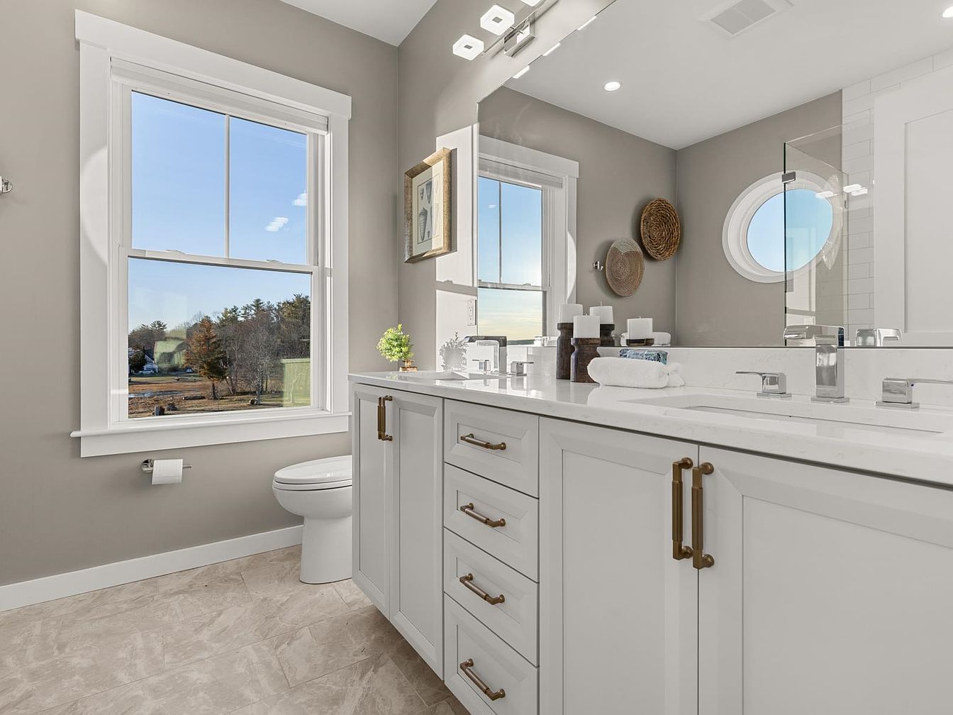 This serene bathroom features a bright and airy layout, with natural light streaming through large windows and a circular accent window adding charm and personality. Elegant white cabinetry with brass hardware provides ample storage, making it easy for families to stay organized. The dual sinks set in a white quartz countertop, complemented by a wide mirror, create a functional space for busy mornings. Neutral wall tones and light marbled flooring set a calm atmosphere, while decorative touches like woven wall art and thoughtfully placed greenery enhance the welcoming yet sophisticated feel, making it ideal for family living and relaxation.