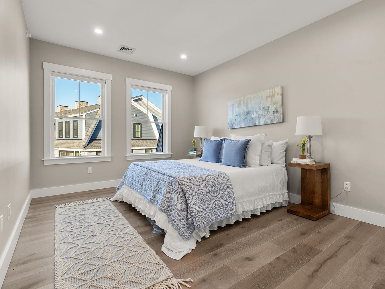 A bright and inviting bedroom features light taupe walls and large windows that flood the space with natural daylight, creating an airy, uplifting atmosphere. The bed, adorned with crisp white linens, blue accent pillows, and a delicately patterned blue throw, serves as the centerpiece, flanked by sleek wooden nightstands topped with matching lamps and fresh flowers. Soft, wide-plank hardwood flooring anchors the room, while a textured area rug adds coziness underfoot. Modern yet comfortable, this layout is easy to navigate, ideal for families, while minimalist decor keeps the room uncluttered, peaceful, and easily adaptable for guests or children.