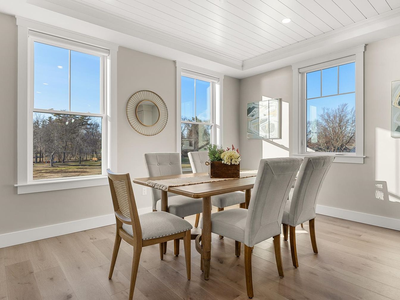 Bright and airy, this dining area features three large windows that fill the space with natural sunlight and offer serene views of the outdoors, creating a peaceful setting for family meals. The room’s soothing neutral palette is complemented by light wood floors and white, shiplap-style ceilings, reflecting a classic American home aesthetic. Elegant upholstered dining chairs surround a rustic wooden table, giving a comfortable, inviting feel perfect for family gatherings or entertaining guests. Minimalist wall art and a decorative mirror add style while keeping the space uncluttered and kid-friendly, ideal for daily living or special occasions.
