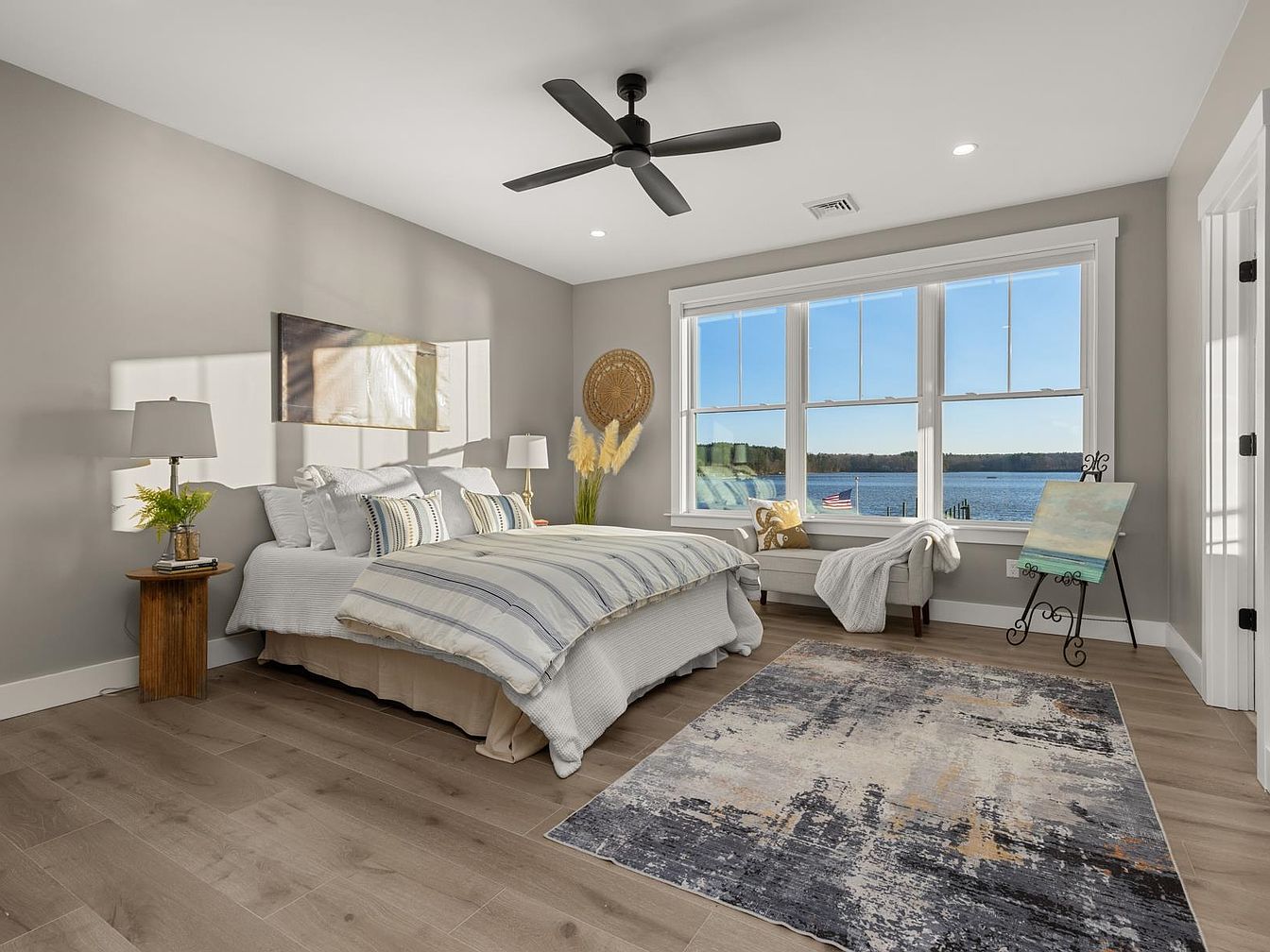A bright and airy bedroom features a picturesque lake view through expansive windows that invite natural light and stunning scenery. The room’s soothing palette combines soft grays and neutrals with cozy white bedding and striped accents for a relaxing atmosphere. Light wood floors add warmth and blend seamlessly with the textured area rug. Minimalist furniture, including an upholstered bench by the window and rustic nightstands, enhance comfort, while family-friendly touches like plush throws and ample pillows make it perfect for relaxing together. Subtle modern elements, such as the black ceiling fan and artistic décor, elevate the space with sophisticated yet inviting charm.