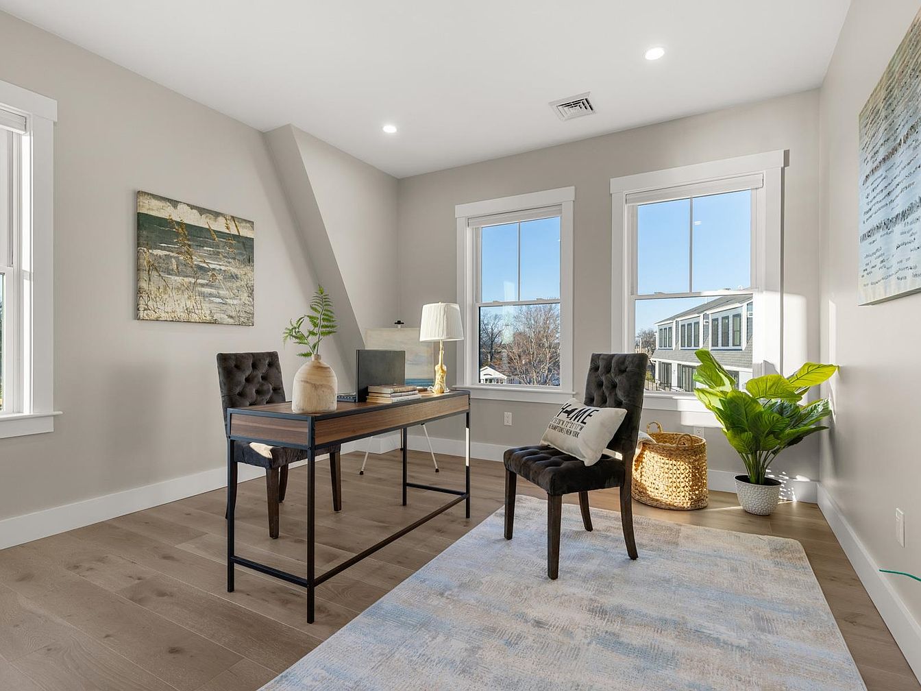 This bright home office is filled with natural light from generous double windows, creating a calming atmosphere that is perfect for productivity or study. The room features soft, neutral walls complemented by wide plank wood floors, while the simple black and wood desk anchors the space. Comfortable, tufted chairs add a touch of classic elegance, and thoughtful décor, including abstract artwork and a large leafy plant, brings warmth to the modern layout. A woven basket and plush area rug contribute to the family-friendly ambiance, making this office a welcoming spot for adults and children to work, read, or create together.