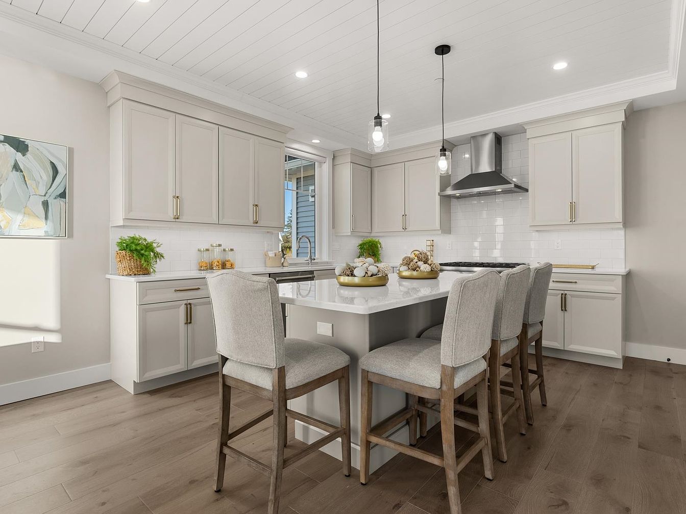 A spacious and inviting kitchen centers around a large quartz island that doubles as a casual dining spot, perfect for family meals or entertaining. The soft, neutral color palette blends gray shaker cabinets, brushed brass hardware, and white subway tile backsplash, creating a modern yet cozy feel. Natural light filters in through a window above the farmhouse sink, enhancing the open atmosphere. Four cushioned counter stools provide ample seating for kids and adults alike. Accents like potted plants, glass jars, abstract wall art, and pendant lighting add warmth and character while the wide-plank wood flooring grounds the space with timeless elegance.