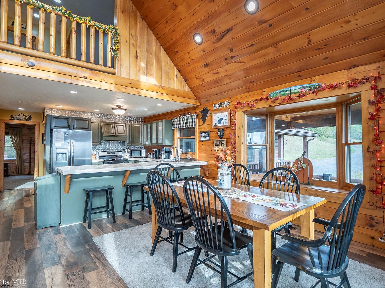 A welcoming open-concept dining and kitchen space features warm wooden walls and high ceilings, evoking classic cabin charm. The dining area is anchored by a sturdy farmhouse table surrounded by black spindle chairs, perfect for family meals. Large windows flood the space with natural light and offer panoramic views of the yard, creating a seamless indoor-outdoor connection. The kitchen blends rustic and modern aesthetics, with slate-gray cabinetry, a stylish tile backsplash, and stainless steel appliances. A spacious breakfast bar with stools invites casual dining and conversation, while festive seasonal decorations add a cozy, family-friendly atmosphere.