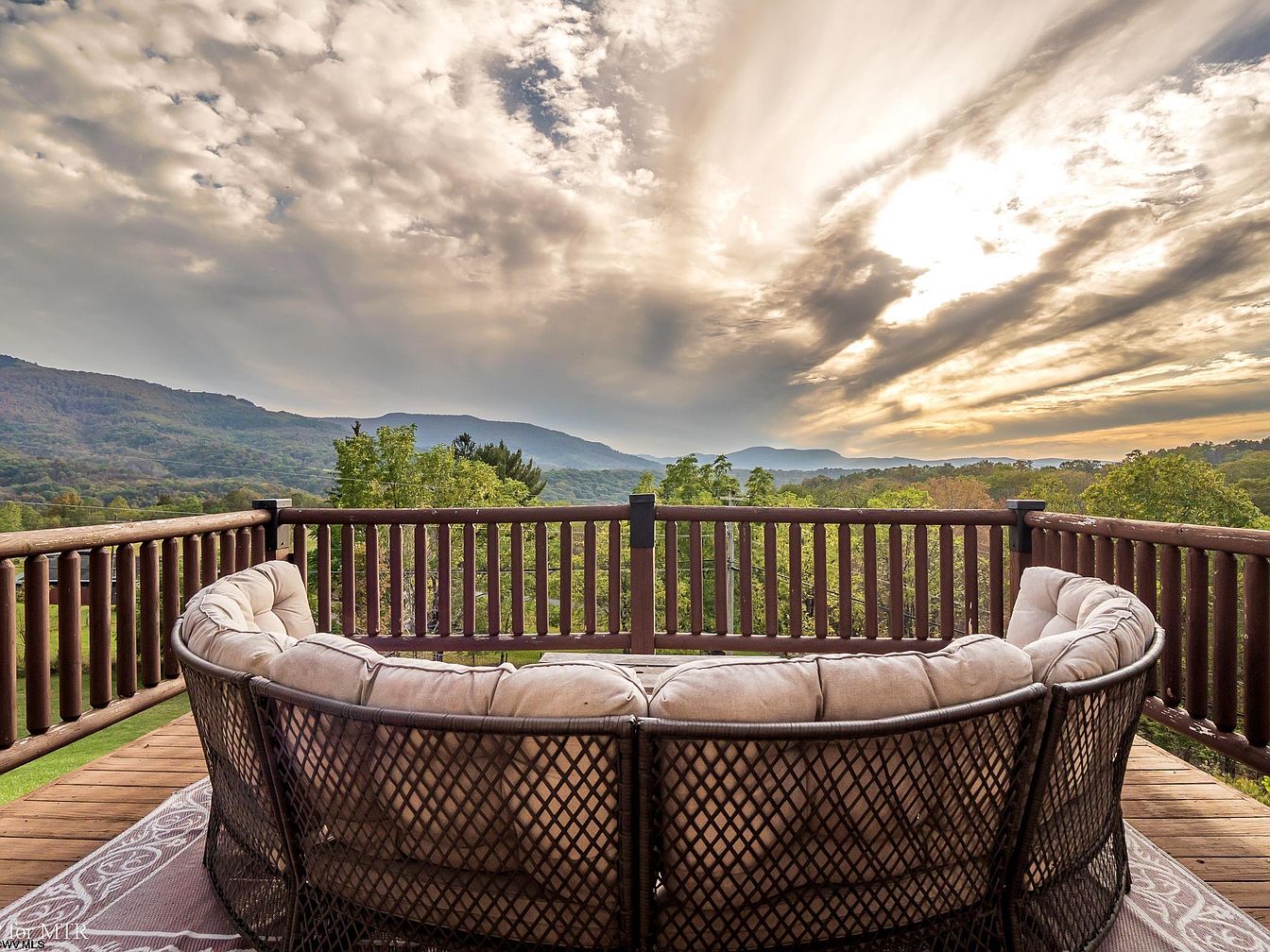 This elevated wooden deck offers a serene outdoor retreat, featuring a spacious curved sectional sofa with plush, inviting cushions ideal for family gatherings or relaxed lounging. The rustic railing, crafted from natural logs, complements the sweeping mountain and valley views, while a large neutral-patterned area rug adds a touch of comfort underfoot. The arrangement encourages conversation and allows unobstructed enjoyment of the panoramic sunset, providing a perfect setting for both quiet moments and lively get-togethers. The muted earth tones and unobtrusive design blend seamlessly with the tranquil landscape, creating an inspiring and harmonious outdoor living space.