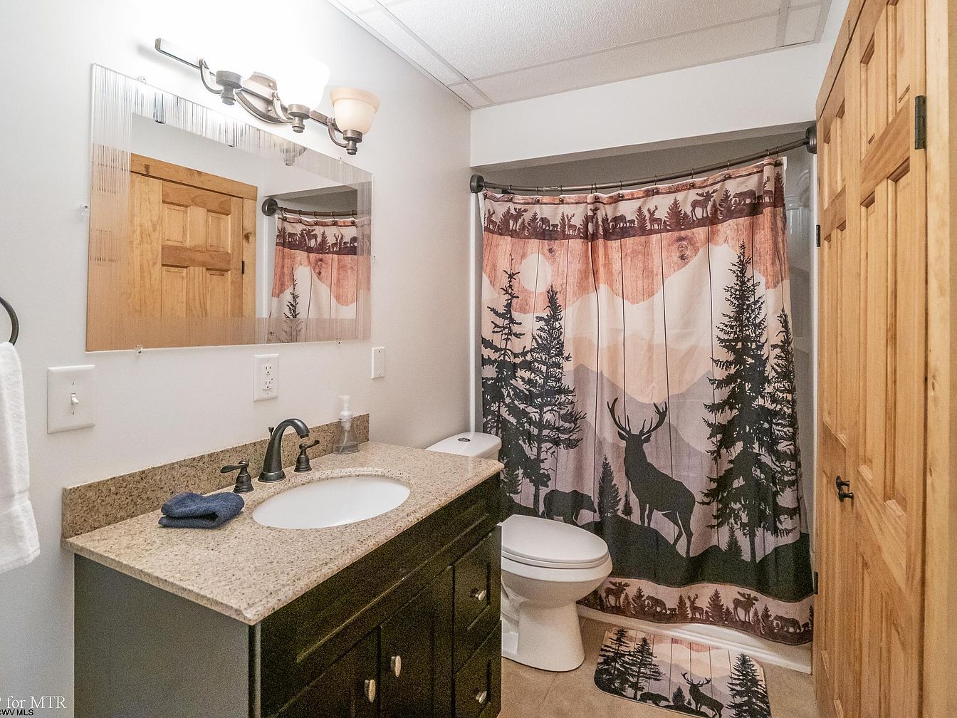 Cozy and welcoming, this bathroom features a harmonious blend of natural wood tones and rustic charm. The wooden doors and cabinetry offer a warm, earthy feel, perfectly complemented by the granite countertop atop a classic vanity. Soft, neutral wall colors keep the space bright and airy. The highlight of the space is the woodland-themed shower curtain and matching rug, which introduce playful wildlife silhouettes and a sense of adventure that will appeal to families and nature lovers alike. Efficient lighting above the large mirror ensures a well-lit space suitable for all ages. Durable materials make this bathroom both practical and inviting.