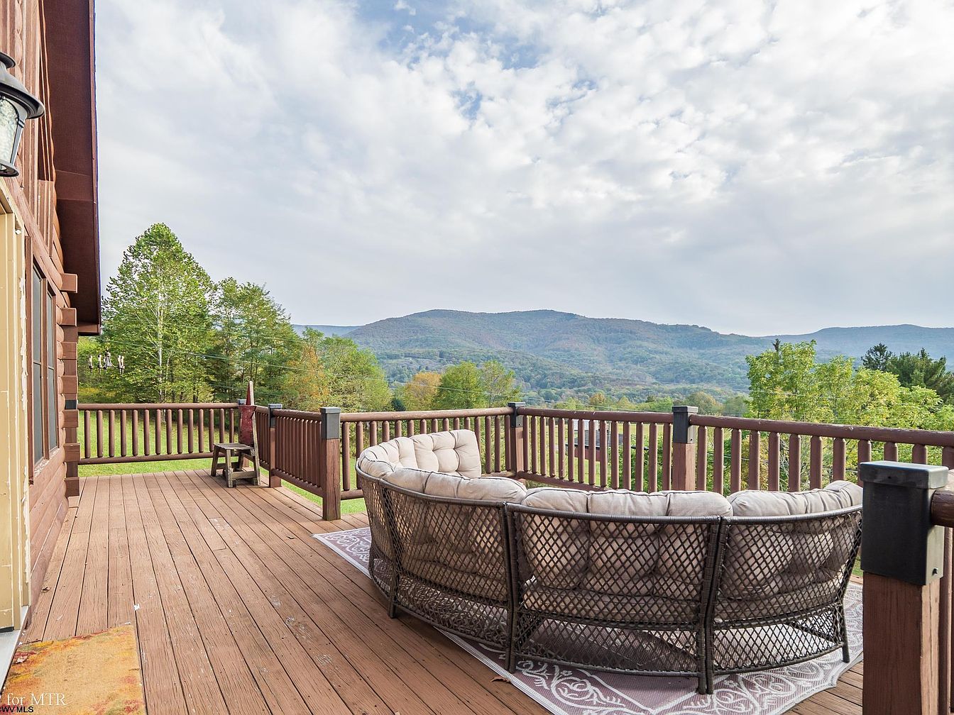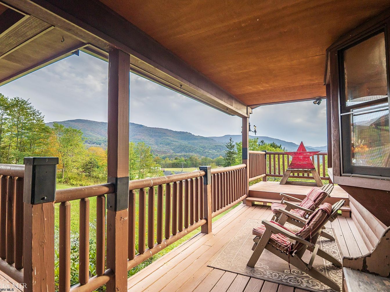 This inviting covered porch offers a tranquil space perfect for family relaxation and gatherings, framed by sweeping mountain views. The sturdy wooden railing and pillars, stained a rich brown, create a rustic yet warm atmosphere that beautifully complements the natural surroundings. Two comfortable Adirondack chairs with striped cushions are arranged for easy conversation or quiet moments, while a decorative rug brings a touch of homey comfort. The porch extends to a raised platform, featuring a picnic table with a striking red star centerpiece, making it a welcoming spot for both kids and adults to enjoy meals or play games outdoors.