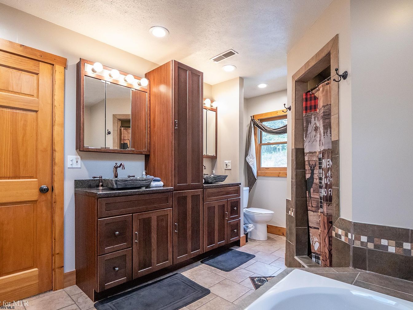 A spacious primary bathroom combines practical family-friendly design with rustic elegance. Dual vessel sinks sit atop sleek granite countertops, framed by rich wood cabinetry that offers ample storage for busy households. Warm wood trim and cabinetry complement neutral tile flooring, adding a cozy mountain-lodge vibe. The room features a separate water closet for privacy, plus a walk-in shower with natural stone accents and playful wilderness-themed curtain—perfect for families with children. Large mirrors over each sink, plentiful lighting, and a soaking tub create a welcoming retreat, all enhanced by fresh air and natural light from the generously sized window.