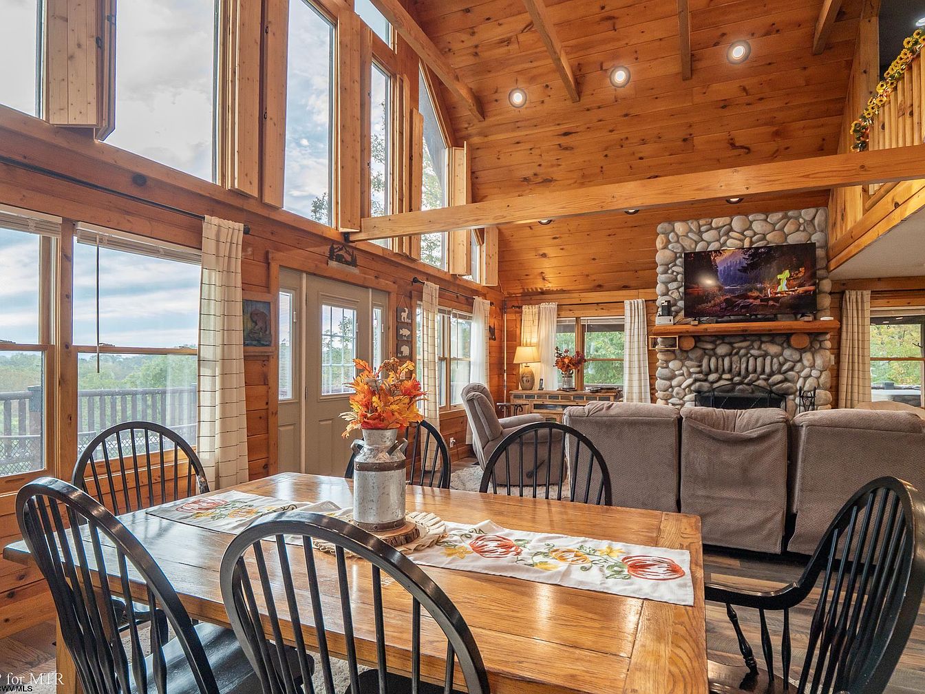 A stunning open-concept living and dining area showcases a high, vaulted ceiling with natural wood beams and floor-to-ceiling windows letting in abundant natural light. The rustic charm is highlighted by honey-toned wood paneling and a stone fireplace, creating a warm, inviting atmosphere. A large wooden dining table with black spindle chairs anchors the space, perfect for family gatherings. Soft beige sofas provide comfortable seating in the living area, ideal for relaxing together by the fire or watching TV. Neutral curtains and seasonal floral accents offer a cozy, family-friendly ambiance that perfectly blends comfort and cabin elegance.