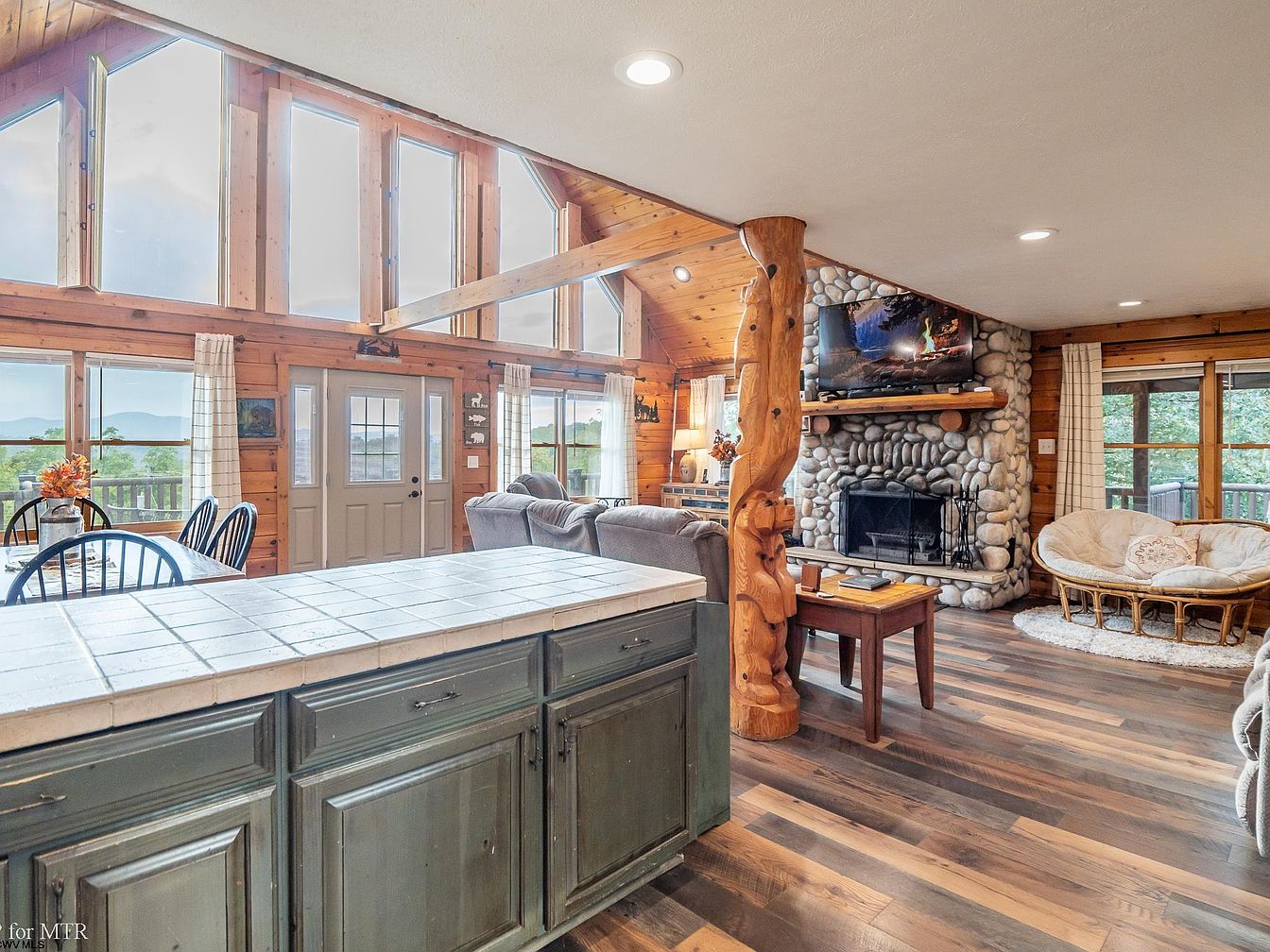 Warm wood paneling and soaring vaulted ceilings create a cozy, inviting living room. Expansive windows flood the space with natural light and offer breathtaking mountain views, perfect for family gatherings and relaxation. Plush, earth-toned sofas line the room, paired with decorative pillows that add pops of color and comfort for all ages. A striking river rock fireplace anchors the space, complemented by rustic details like a solid wood coffee table and a charming area rug. The mix of natural wood finishes and soft textiles provides a balanced, family-friendly ambiance, ideal for movie nights, reading nooks, or enjoying the scenic surroundings.