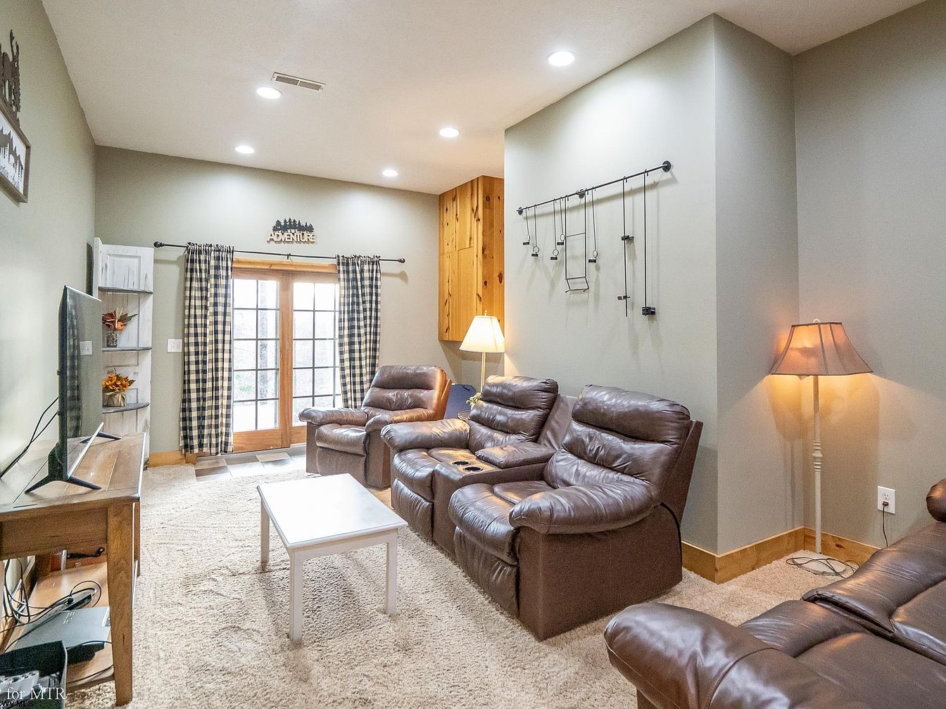 A warm and welcoming living room features plush brown leather recliners arranged for easy conversation and TV viewing, making it ideal for family movie nights. Neutral wall colors are complemented by wooden trim and French doors with checkered curtains that invite natural light and provide access to the outdoors. Soft carpeting enhances comfort for children to play, while carefully placed floor lamps add gentle ambiance for relaxing evenings. Decorative wall accents, minimalist shelving, and a simple white coffee table contribute to the casual, family-friendly atmosphere. The space balances relaxation with functionality, perfect for both everyday living and entertaining guests.