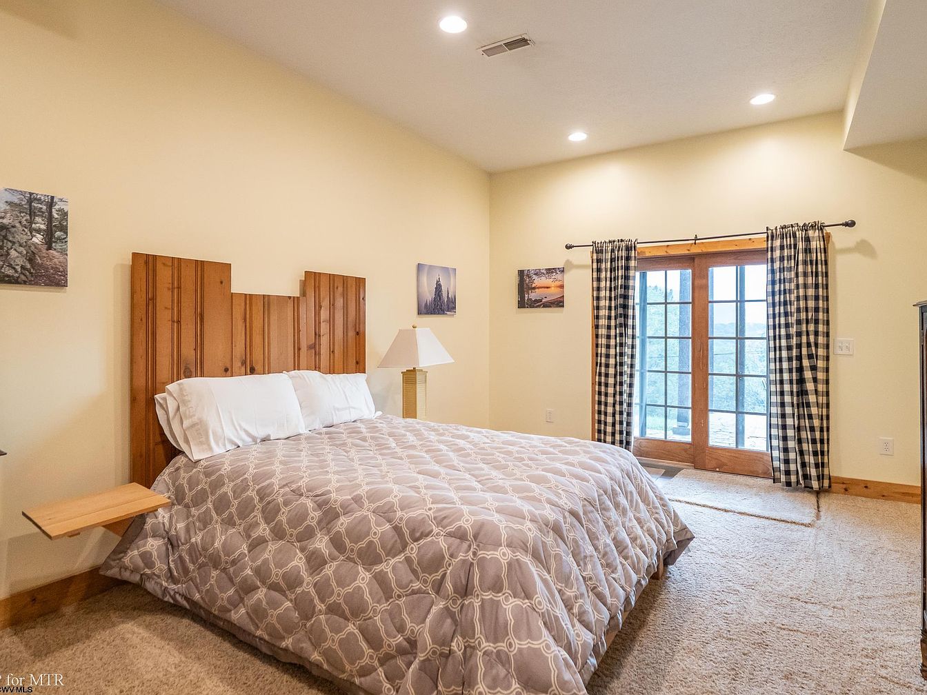 A spacious master bedroom featuring plush beige carpeting and soft lemon cream walls, creating a warm and inviting atmosphere. The focus is a large bed with a distinct wood-plank headboard and crisp white linens, ideal for restful nights. Natural light pours in through French doors with black-and-white checkered curtains, adding a cozy touch and offering easy access to the outdoors. Gentle recessed lighting and scenic wall art enhance the relaxing feel. The uncluttered layout is both functional and family-friendly, perfect for unwinding as a couple or with young children seeking comfort and closeness.
