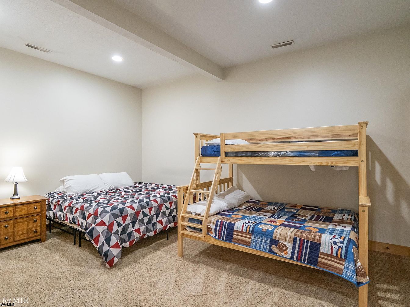 A spacious and inviting family bedroom features cozy beige carpeting and soft, neutral walls that create a calm and welcoming atmosphere. Designed for both comfort and practicality, the room boasts a twin-over-full wooden bunk bed and a queen-sized bed, making it ideal for families or guests with children. Colorful geometric and playful patchwork bedding adds a cheerful touch, while simple wood furniture, including a three-drawer nightstand with a classic lamp, ensures ample storage and convenience. Recessed lighting brightens the space, and uncluttered decor highlights the room’s flexible layout, perfect for restful nights, playtime, or relaxed family gatherings.