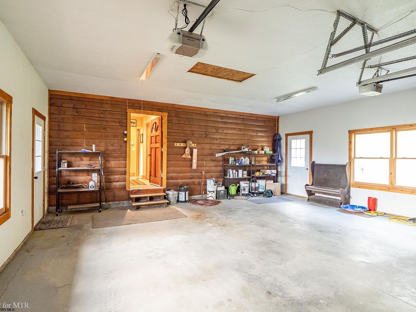 This garage features a generous open layout ideal for multiple vehicles or large-scale storage, accented with warm wood-paneled walls and natural trim around doors and windows. Shelving units line the back, offering practical organization for tools, household supplies, and sports gear, with a dedicated coat rack for outerwear and accessories. The entryway leads conveniently into the main house, with easy-clean cement flooring for family use and durability. Ample windows fill the space with daylight, creating a welcoming, safe environment for children’s bike storage or hobby activities. Neutral hues and rustic wood touches blend functionality with a cozy, homey feel.