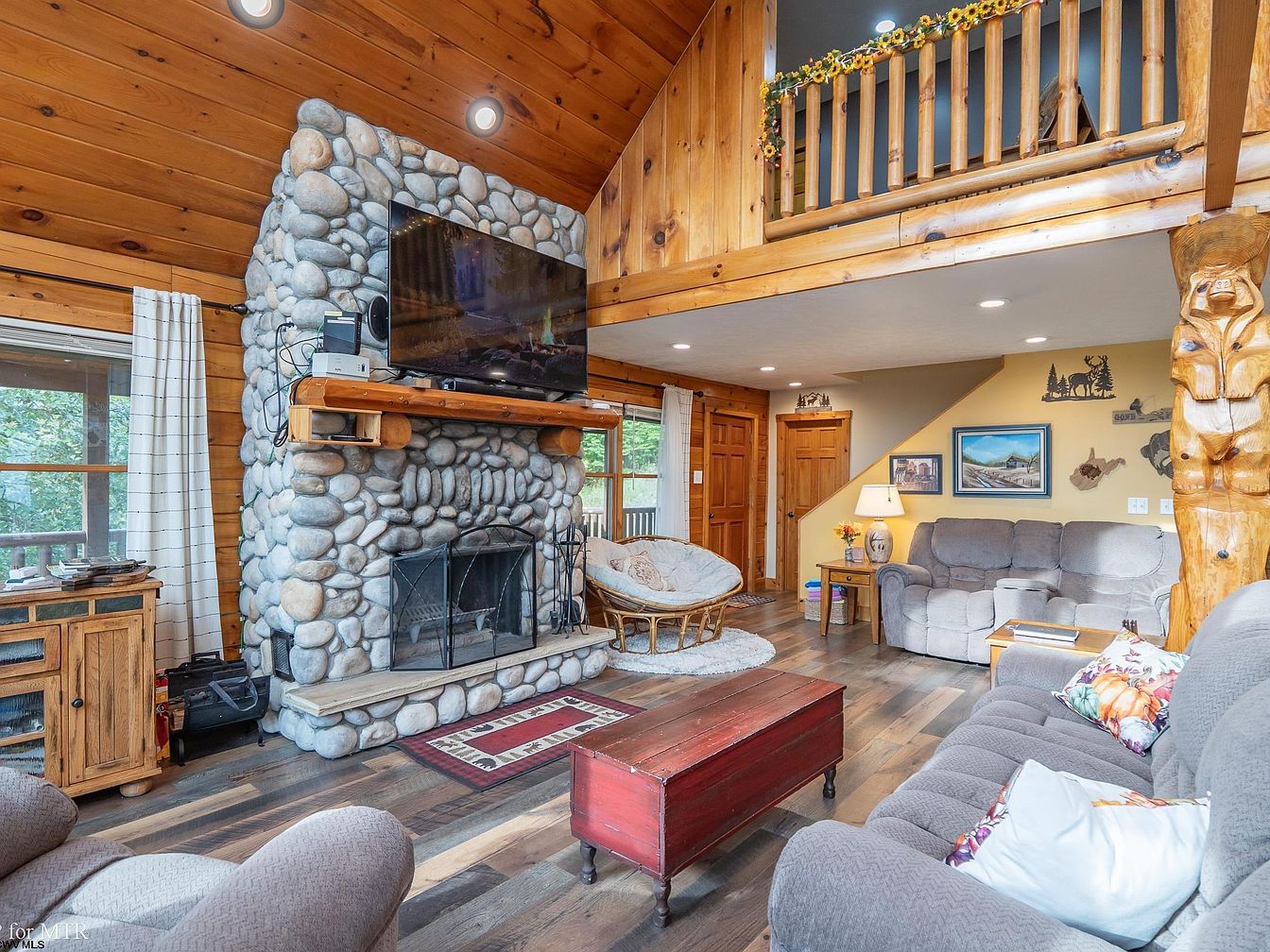 Warmth and comfort define this inviting living room, where natural materials and thoughtful details create a welcoming family retreat. A striking river rock fireplace anchors the space, topped with a sleek wooden mantle and large television for casual gatherings. The vaulted ceiling and exposed wood paneling add to the cozy cabin aesthetic, while large windows let in abundant light and provide views of surrounding trees. Soft gray seating, a rustic wood coffee table, and a papasan chair offer relaxation and ample room for family activities. Unique touches like carved balustrades and playful wood bear carvings add charm to the cheerful, family-friendly environment.