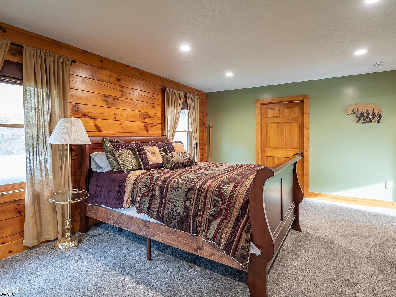 A spacious, inviting bedroom features warm wood-paneled walls and a soothing green accent wall, creating a rustic yet serene atmosphere. The large wooden sleigh bed is adorned with an abundance of plush, patterned pillows and a richly detailed bedspread, perfect for family relaxation and comfort. Natural light filters in through generous windows dressed in soft beige curtains, enhancing the cozy ambiance. Neutral carpeting underfoot adds warmth and softness, making it a safe, comfortable space for all ages. Simple yet elegant details, such as a glass-base floor lamp and whimsical bear wall art, add personal character and charm.