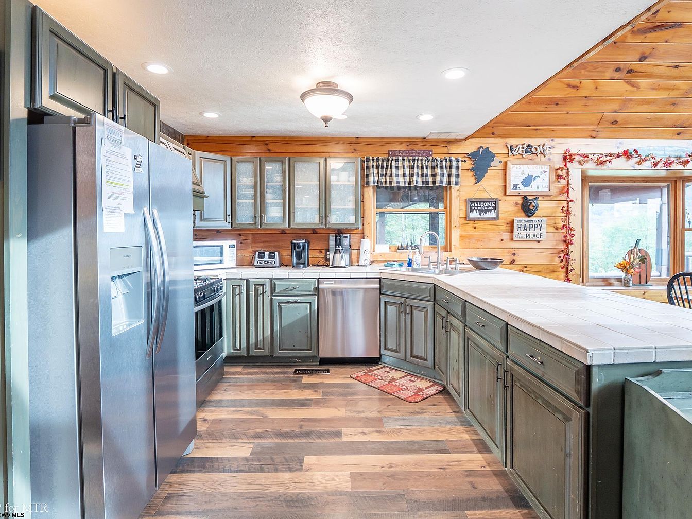 A spacious kitchen with a rustic charm, featuring sage green cabinetry, stainless steel appliances, and a large wraparound tile countertop perfect for family gatherings. Warm wood paneling and matching wood floors create a cozy, inviting atmosphere, complemented by country-style decor, cheerful wall signs, and a plaid valance above the sink window. Ample cabinetry provides practical storage for a busy household, while the under-cabinet lighting and central overhead fixture ensure a bright, welcoming space. A small rug adds softness near the sink, and a dining nook by the bay window invites natural light, making it ideal for everyday family life.