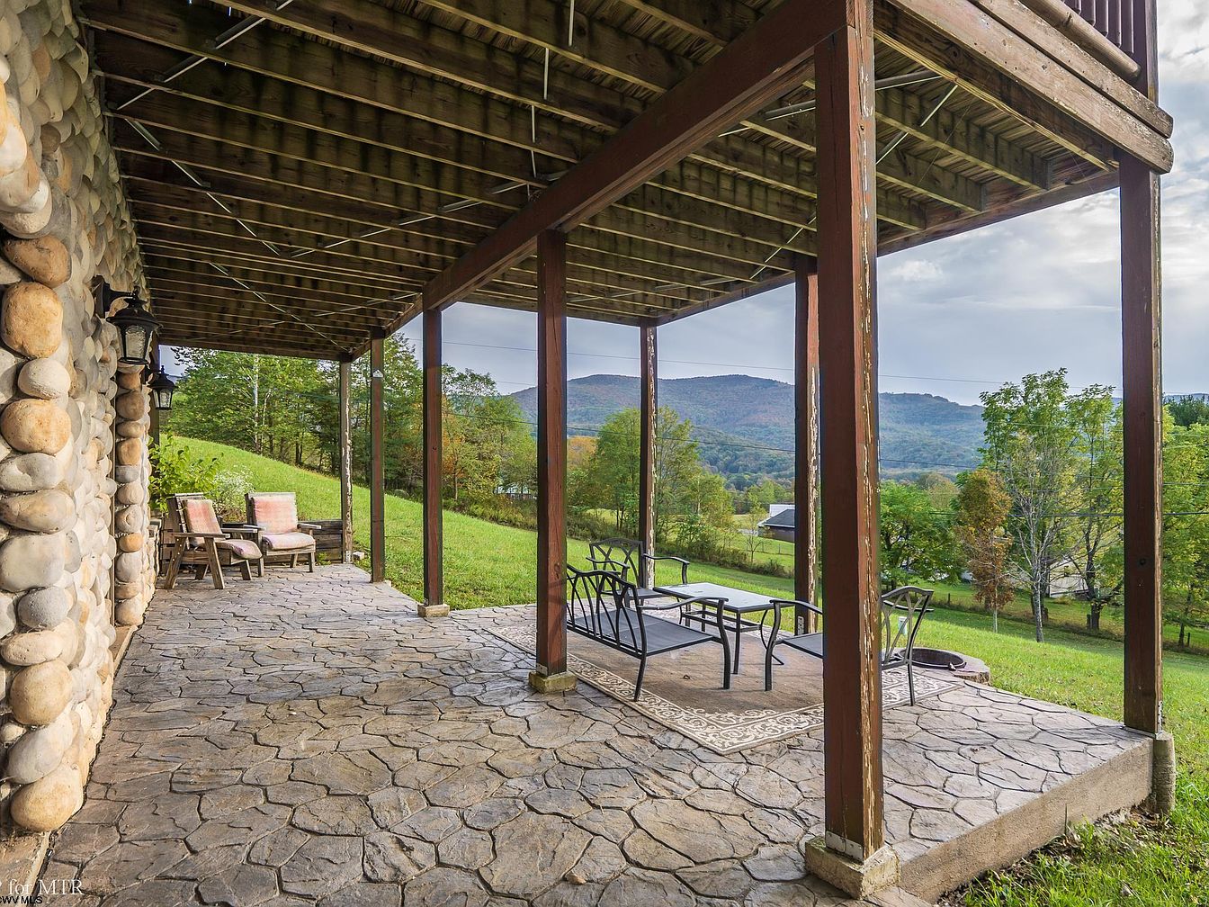 A spacious outdoor patio showcases rustic charm with its sturdy stone flooring and natural stone wall. Wooden beams support the overhead deck, adding an architectural touch that blends seamlessly with the surrounding landscape. Comfortable seating areas, including cushioned chairs and a metal dining set on a decorative outdoor rug, create an inviting atmosphere for gatherings or quiet family moments. The open layout provides ample space for children to play, while adults can enjoy the panoramic mountain views. Neutral tones in the stone and wood complement the lush greenery and rolling hills, enhancing the sense of tranquility and connection to nature.