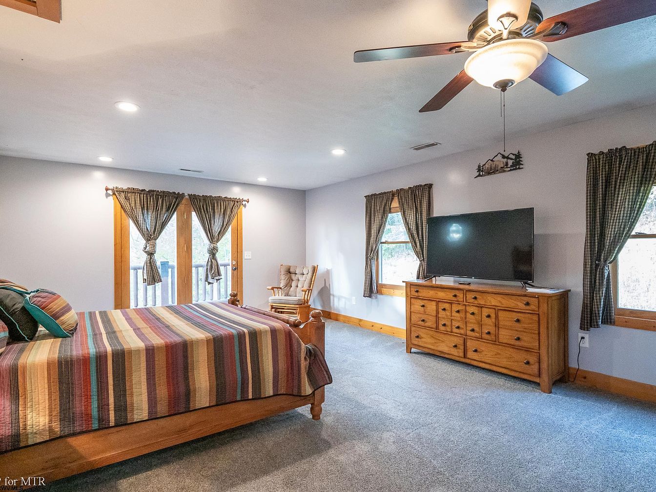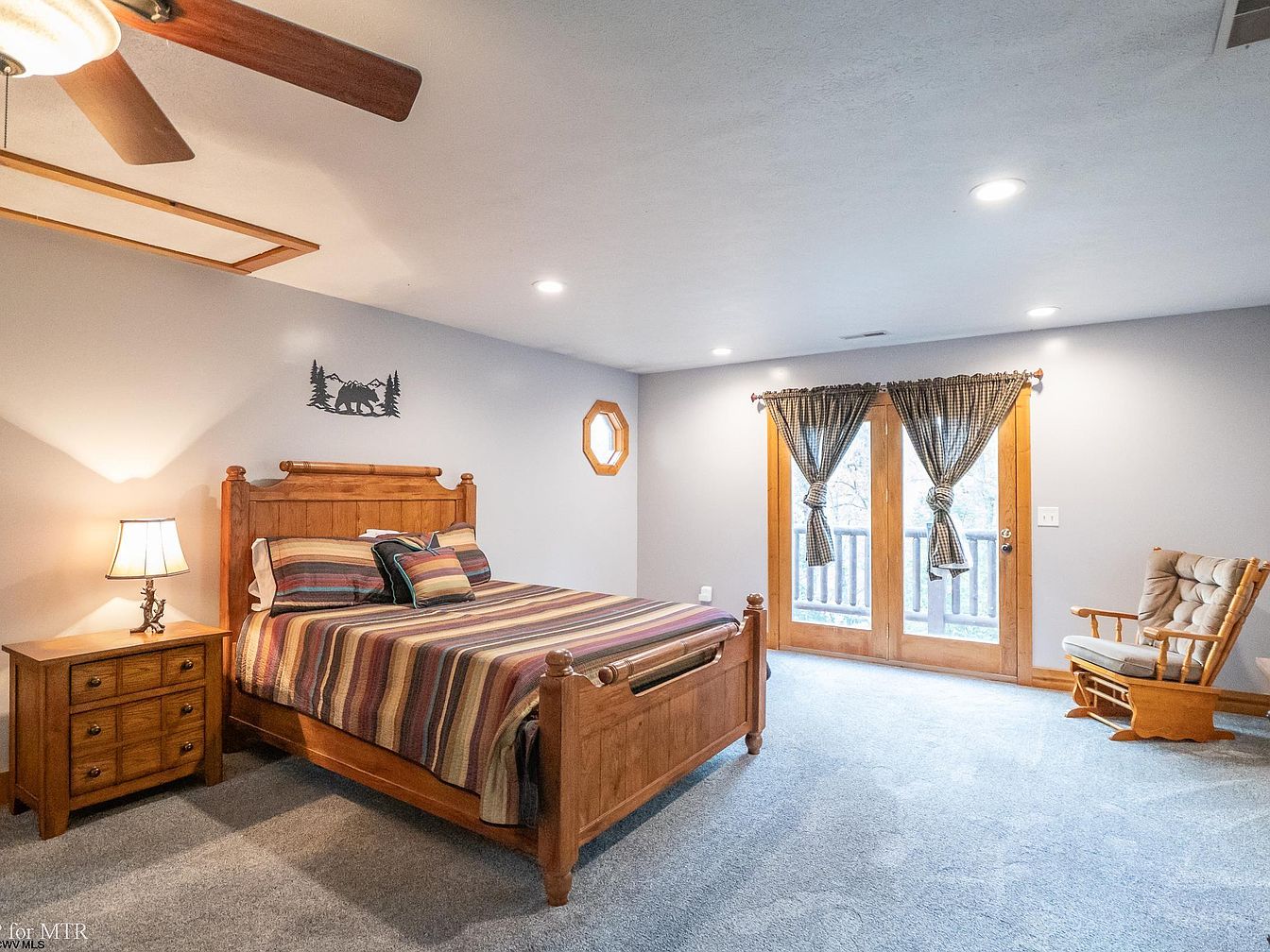 Spacious master bedroom exudes warmth with plush carpeting and solid wood furnishings, including a classic bed frame and matching nightstand. Soft gray walls serve as a subtle backdrop, complementing the earthy tones of the striped bedding and natural wood elements. French doors with checked curtains open to a private balcony, allowing abundant natural light and offering serene outdoor views. A cozy rocking chair in the corner creates a perfect reading nook, adding to the room’s family-friendly appeal. Overhead recessed lighting and a ceiling fan enhance comfort, while rustic details and simple decor cultivate a peaceful, welcoming atmosphere.