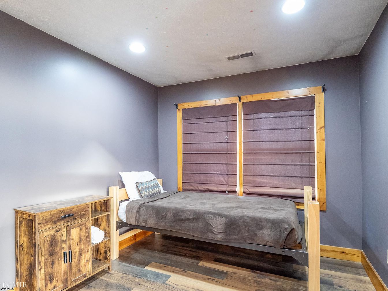 A welcoming bedroom exudes warmth with rustic wood accents framing the windows and matching the small bedside cabinet. The bed’s natural wood frame and plush bedding create a comfortable sleeping area suitable for both kids and adults, emphasizing family-friendly practicality. Soft grey walls are complemented by deep brown window shades, maintaining privacy and a soothing color palette. Wide plank floors in natural tones add texture and coziness, while recessed lighting provides ample illumination. The room’s uncluttered layout ensures easy movement, making it perfect for relaxation and peaceful nights, all while retaining a stylish, modern-rustic feel.