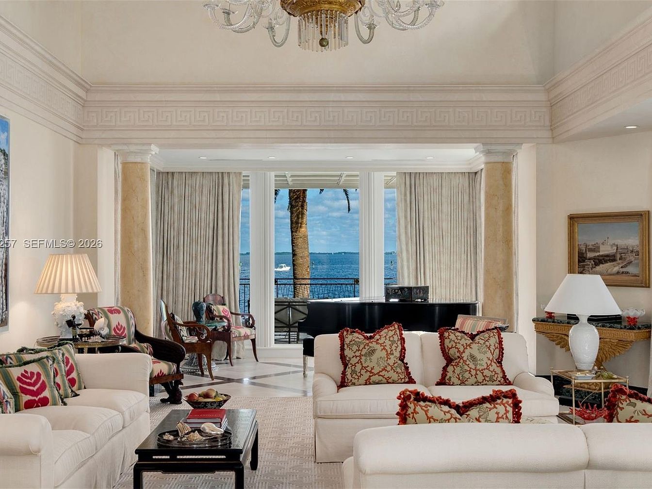This elegant living space features high ceilings adorned with intricate moldings that highlight the luxurious ambiance. Soft, neutral tones create a serene backdrop, complemented by vibrant accent pillows on plush sofas, adding a touch of warmth. Large windows invite natural light and provide breathtaking views of the waterfront, enhancing the openness of the room. The layout encourages family interactions, with comfortable seating arranged around a chic coffee table. Decorative elements like the fine chandelier and tasteful artwork bring sophistication, while light drapes frame the windows, allowing for both privacy and stunning outdoor vistas. Ideal for gatherings or quiet evenings.