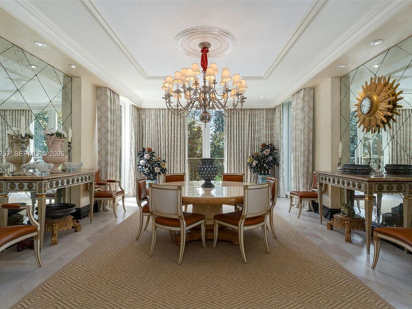 A stunning dining room exuding sophistication and inviting warmth. Central to the space is a grand, round table surrounded by elegantly styled chairs with caramel leather accents, perfect for family gatherings or intimate dinners. The ceiling features a decorative medallion with a striking chandelier, providing a soft yet radiant glow. Large windows dressed in beautiful drapes allow natural light to pour in, enhancing the airy atmosphere. Mirrored walls reflect the exquisite details, while ornate sideboards add classic charm. The subtle beige and gold color scheme creates a serene backdrop, making this dining area a delightful focal point for any home.