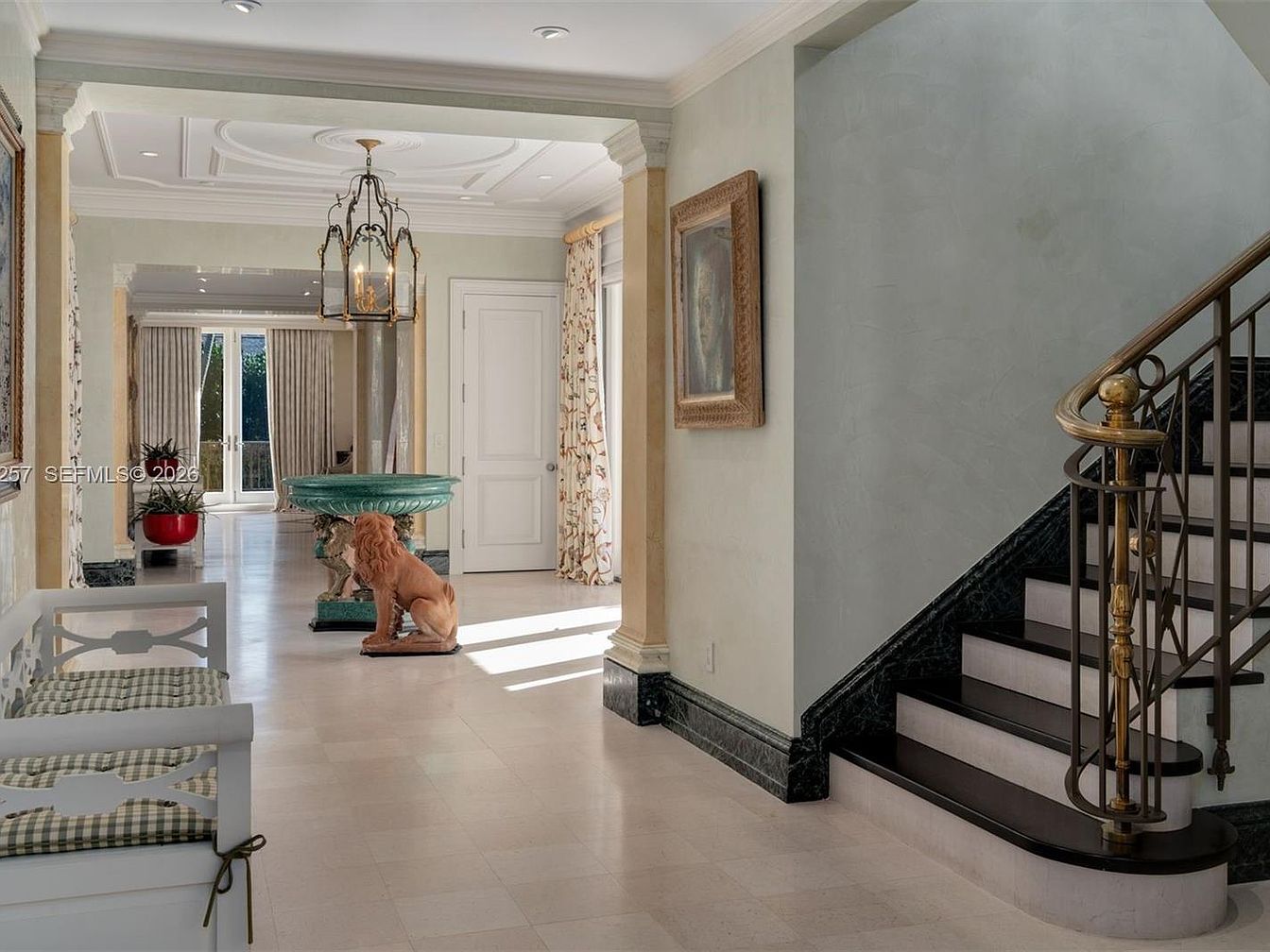 This elegant entrance hallway features a stunning layout with a grand staircase that beckons exploration. A luxurious light fixture illuminates the space, enhancing the soft, muted color scheme of pastel walls and marble flooring. A striking green pedestal table adds a unique pop of color, while a charming lion statue invites playful curiosity. The space is adorned with floral drapery that complements the inviting atmosphere, promoting a family-friendly feel. Fine architectural details, including crown molding and intricate ceiling designs, enhance the opulence, creating a warm and welcoming introduction to the home.