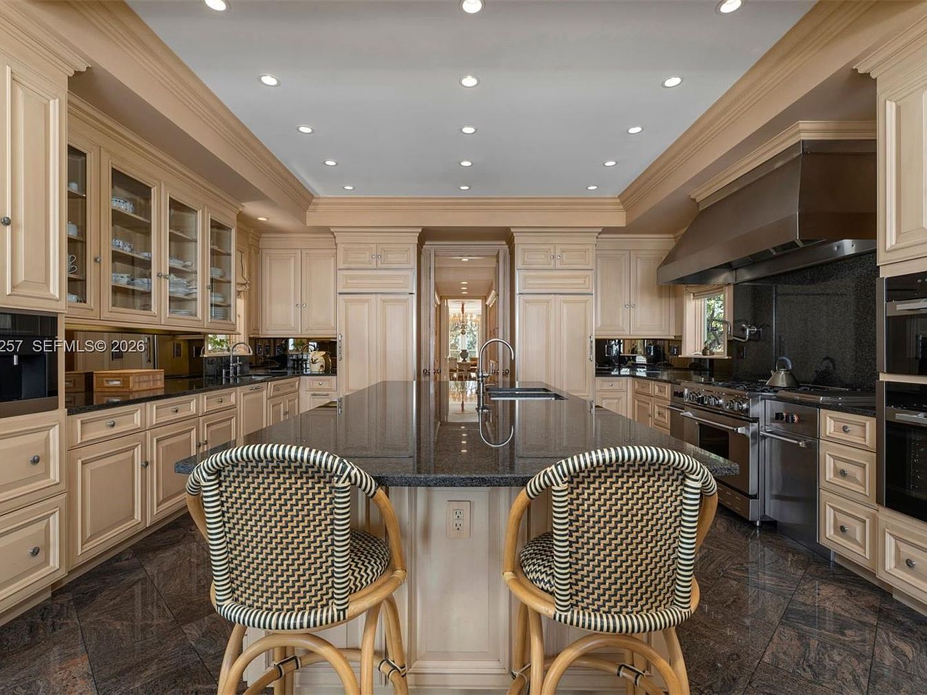 This spacious kitchen features an exquisite blend of functionality and style, highlighted by its warm beige cabinetry with intricate detailing. A stunning central island topped with sleek black granite serves as an ideal gathering spot, complemented by elegant bar stools. The kitchen is designed with family-friendly features, providing ample storage and a well-organized layout. High-end appliances seamlessly integrated into the cabinetry ensure culinary convenience. The glossy marble flooring adds sophistication, while abundant natural light floods in through large windows, creating an inviting atmosphere that makes cooking and entertaining a delightful experience for families.