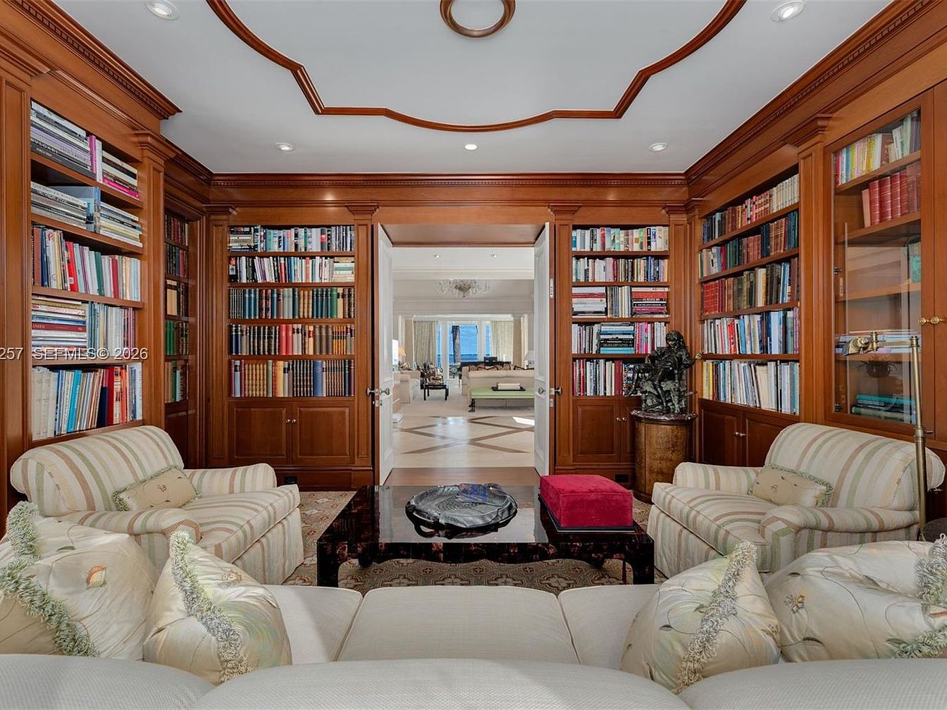 This cozy library nook boasts rich wooden cabinetry filled with an extensive collection of books, creating an inviting atmosphere for reading and relaxation. Soft hues of cream and muted pastels dominate the color scheme, harmonizing beautifully with the subtle patterns of the plush armchairs and decorative cushions. Architectural details include a coffered ceiling that enhances the room’s height and elegance. A sleek coffee table adds functionality, while a charming sculpture provides a touch of artistic flair. This intimate space is perfect for family gatherings, encouraging quiet reading time or lively discussions.