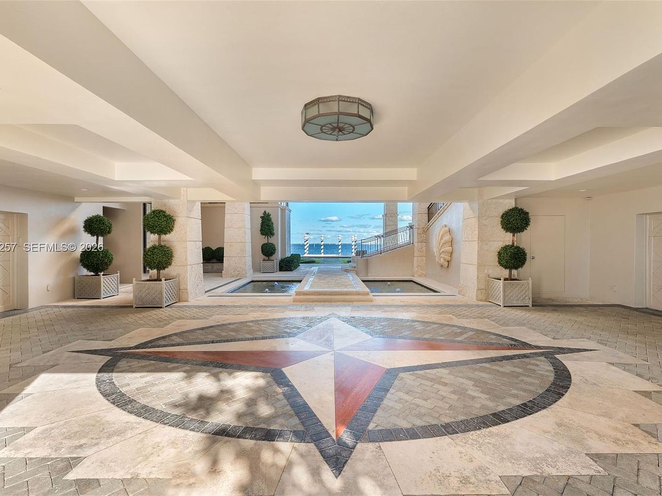This elegant entryway captivates with its sophisticated design and spacious layout. Crafted with polished stone flooring, a striking star motif serves as the centerpiece, creating an inviting atmosphere. Flanking the pathway, charming topiary plants in decorative planters enhance the home’s appeal, while the coffered ceiling adds a touch of architectural elegance. Natural light floods the space through expansive openings, seamlessly connecting indoor and outdoor areas. The soft neutral color palette promotes tranquility, perfect for family gatherings. With its open feel and artistic details, this entryway sets the tone for a luxurious coastal lifestyle, combining beauty with functionality.