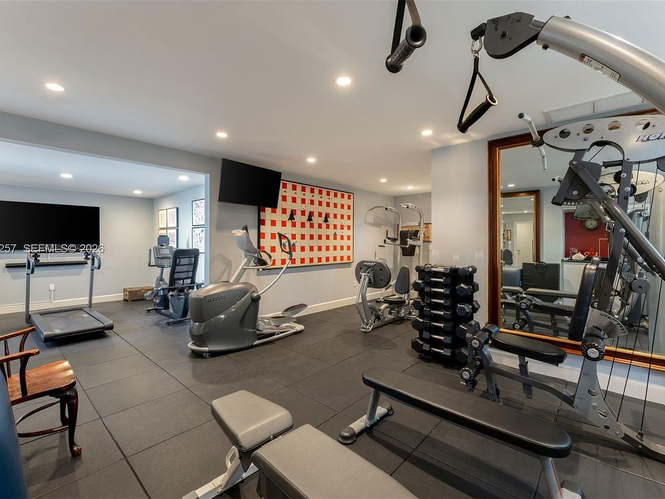 This home gym features a spacious layout with essential fitness equipment, designed for both functionality and aesthetics. A mix of sleek, modern machines harmonizes with a vibrant, geometric art piece on a feature wall, energizing the space. A neutral color scheme enhances the sense of openness, while ample lighting creates an inviting atmosphere. Rubber flooring provides safety and comfort, making it family-friendly for users of all ages. Strategically placed mirrors expand the visual space and allow for form-checking during workouts. A cozy corner offers a seating option, perfect for moments of rest or brainstorming fitness goals.